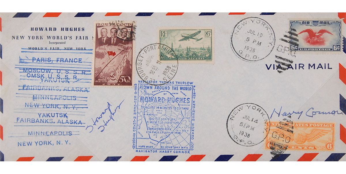 Rare and desirable commemorative airmail postal cover, 9.5 x 4, carried by Hughes on his triumphant 1938 around-the-world flight, signed in fountain pen by Hughes, "Howard Hughes," and his co-pilot, "Harry Connor." The cover, issued in conjunction with the 1939 New York World’s Fair, bears several postage stamps, postmarks, and rubber stamps indicating the primary stops on the record-setting journey: Paris, Moscow, Omsk, Yakutsk, Fairbanks, Minneapolis, and the final destination, New York City. Also includes a fabric 12 x 8 American flag carried on the journey around the globe. Attractively matted and framed with a small descriptive plaque to an overall size of 19.25 x 24. In fine condition. In 1938, Hughes set a new around-the-world record of 3 days, 19 hours and 8 minutes. The flight took off on July 10 from an airfield on Long Island, New York, in a specially designed Lockheed 14N ‘Super Electra’ aircraft with a range of nearly 5,000 miles, making stops in the aforementioned cities, and establishing Hughes as a national hero.
