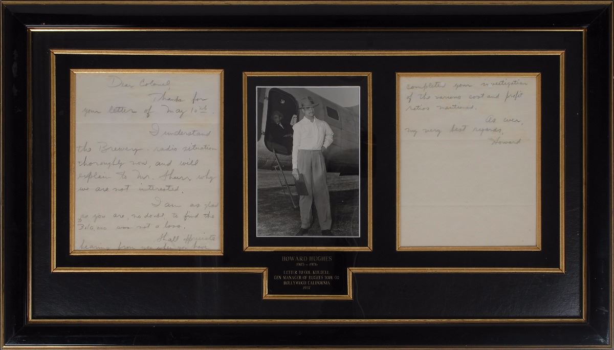 ALS signed “Howard,” two pages, 7.75 x 9.75, no date but circa May 1937. Letter to Colonel Kuldell, the general manager of Hughes Tool Co. In part: “I understand the Brewery-radio situation thoroughly now, and will explain to Mr. Shurn why we are not interested. I am as glad as you are, no doubt, to find the $340,000 was not a loss. Shall appreciate hearing from you when you have completed your investigation of the various cost and profit ratios mentioned.” Impressively double-matted and framed with a portrait and plaque to an overall size of 35 x 20. In fine condition, with mild staining and punch holes to the top of the second page. R. C. Kuldell was a close friend of Hughes’s father and the head executive of Hughes Tool, but in 1938 was forced out of the company. Handwritten letters by Hughes are rare, this being one of just a handful we have ever offered. Oversized.