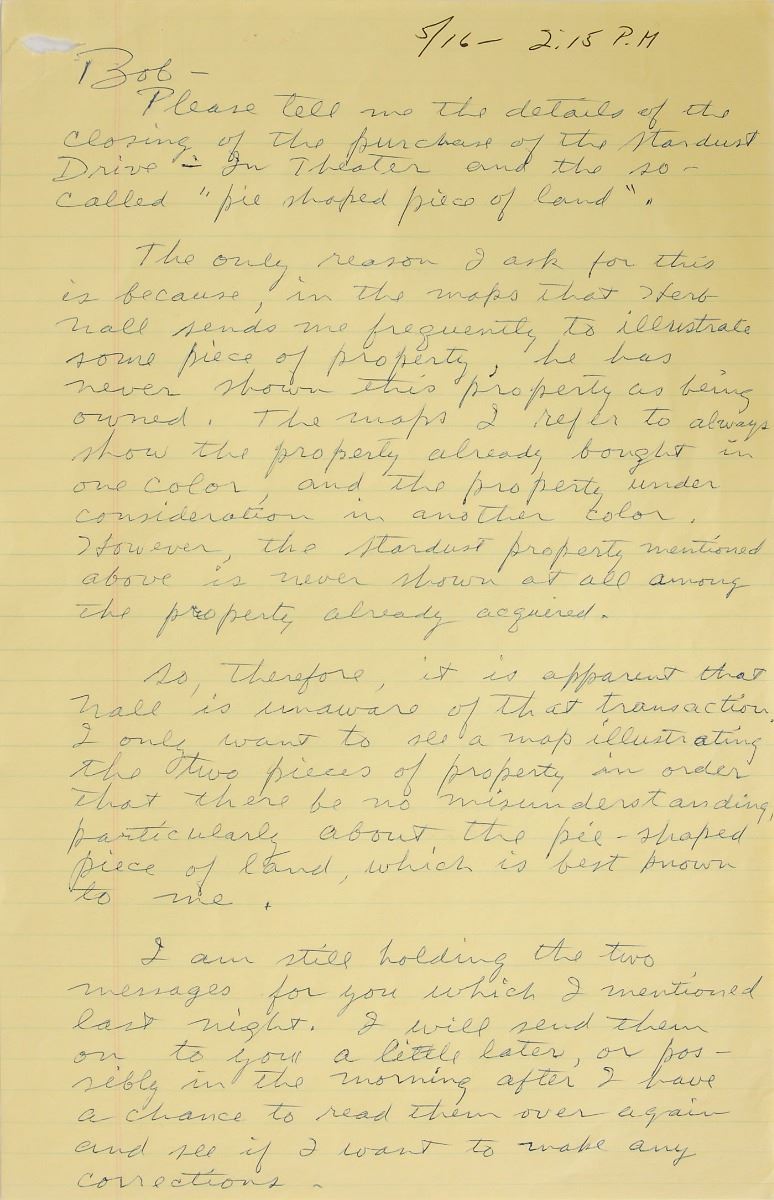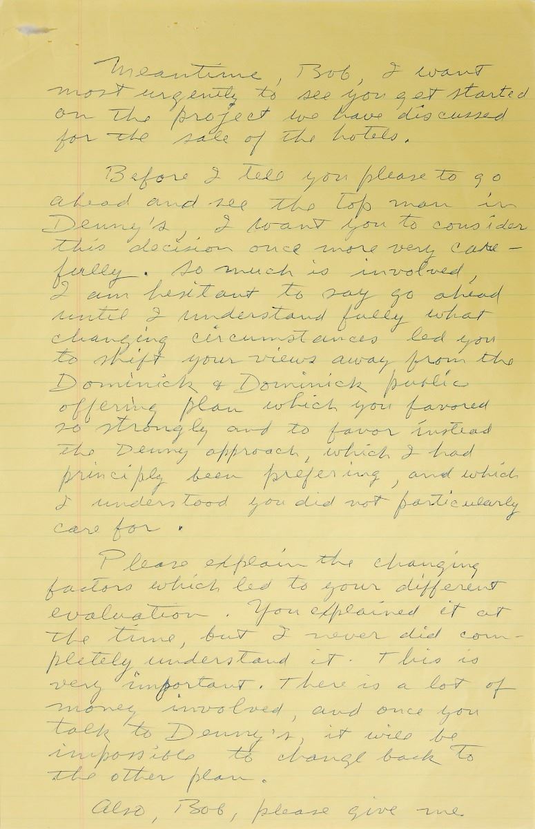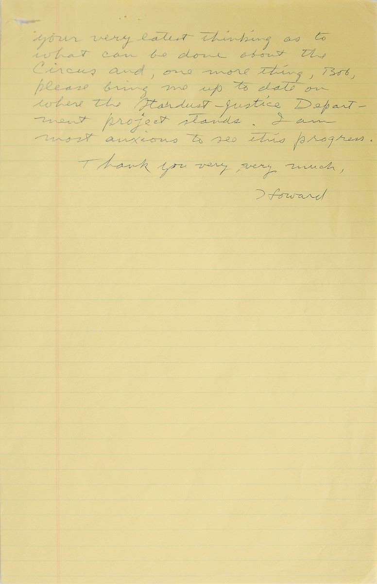 ALS signed “Howard,” three pages, lightly-lined, 8.5 x 13.25, date penned in another hand, “5/16—2:15 P.M.” Letter to his assistant, confidant, and former FBI agent, Robert “Bob” Maheu, in full: “Please tell me the details of the closing of the purchase of the Stardust Drive-In theater and the so-called 'pie shaped piece of land.’ The only reason I ask for this is because, in the maps that Herb Nall sends me frequently to illustrate some piece of property, he has never shown this property as being owned. The maps I refer to always show the property already bought in one color, and the property under consideration in another color. However, the Stardust property mentioned above is never shown at all among the property already acquired. So, therefore, it is apparent that Nall is unaware of that transaction. I only want to see a map illustrating the two pieces of property in order that there be no misunderstanding particularly about the pie-shaped piece of land, which is best known to me. I am still holding the two messages for you which I mentioned last night. I will send them on to you a little later, or possibly in the morning after I have a chance to read them over again and see if I want to make any corrections. Meantime, Bob, I want most urgently to see you get started on the project we have discussed for the sale of the hotels. Before I tell you please to go ahead and see the top man in Denny's, I want you to consider this decision once more very carefully. So much is involved, I am hesitant to say go ahead until I understand fully what changing circumstances led you to shift your views away from the Dominick & Dominick public offering plan which you favored so strongly and to favor instead the Denny approach, which I had principly [sic] been prefering [sic], and which I understood you did not particularly care for. Please explain the changing factors which led to your different evaluation. You explained it at the time, but I never did completely understand it. This is very important. There is a lot of money involved, and once you talk to Denny’s, it will be impossible to change back to the other plan. Also, Bob, please give me your very latest thinking as to what can be done about the circus and, one more thing, Bob, please bring me up to date on where the Stardust—Justice Department project stands. I am most anxious to see this progress. Thank you very, very much.” In fine condition, with small area of staple-related paper loss to the upper left corner of each page. Despite having never met face-to-face, Maheu was one of Hughes’s closest aides and trusted advisor’s during the 1960’s. Most significantly, Maheu shielded Hughes from the public and orchestrated the deals that made the reclusive billionaire a Las Vegas power player during the city's critical development period.