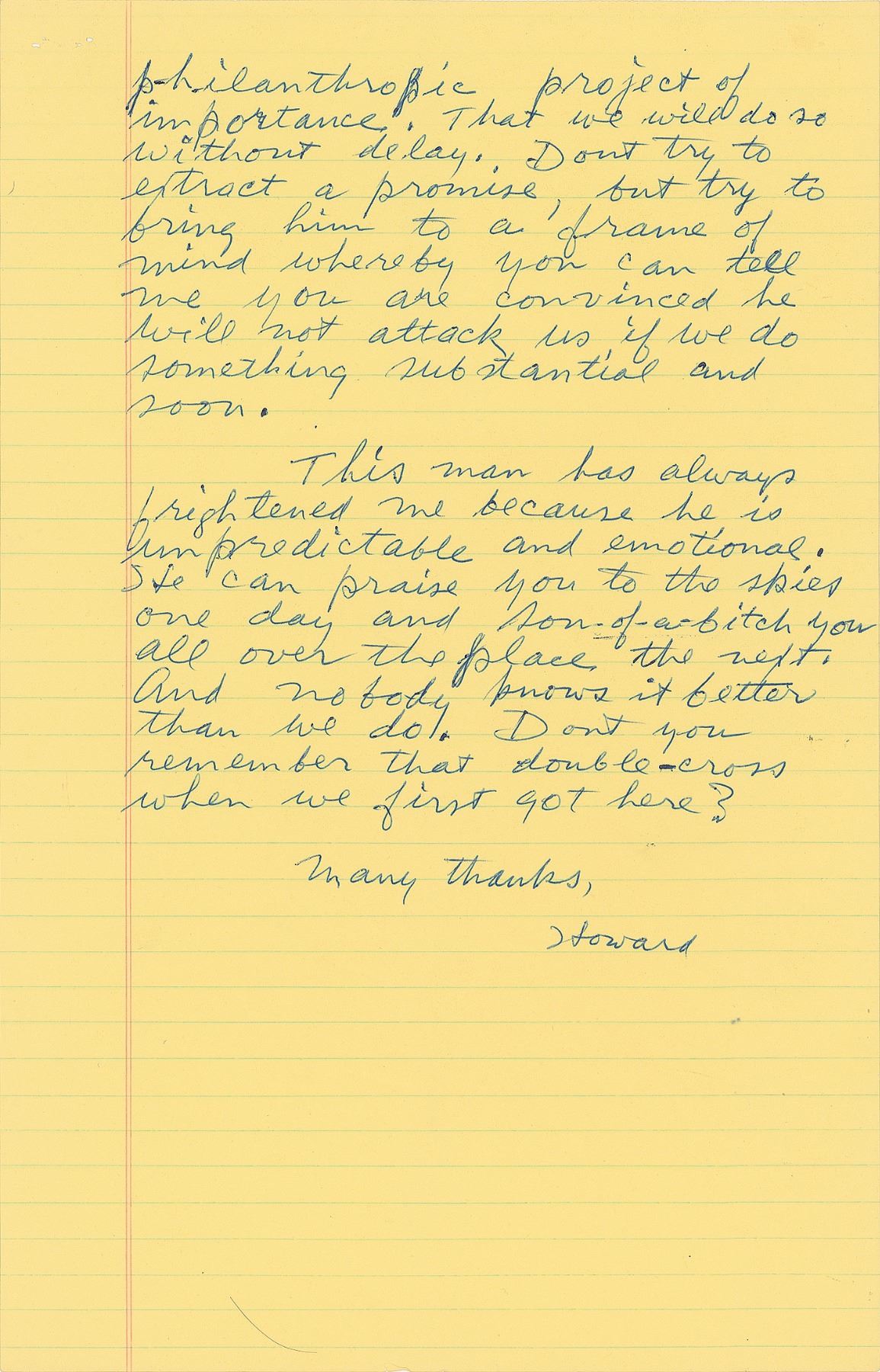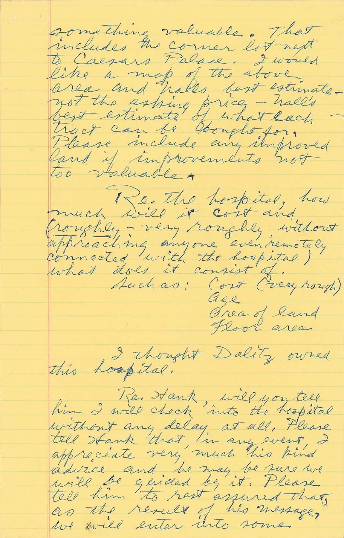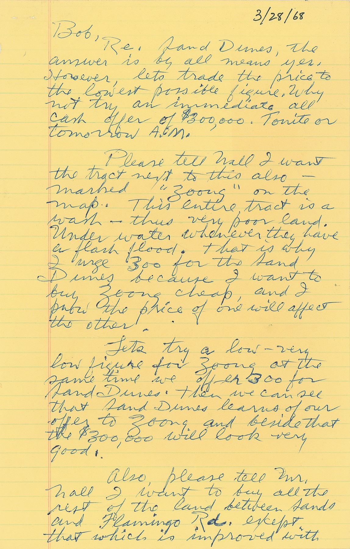 Very desirable ALS signed “Howard,” three pages, 8.5 x 13.25, March 28, 1968. Letter to his assistant, confidant, and former FBI agent, Robert "Bob" Maheu, in part: "San Dunes, the answer is by all means yes. However, lets trade the price to the lowest possible figure. Why not try an immediate all cash offer of $300,000. Tonite or tomorrow a.m. Please tell Nall I want the tract next to this also—marked 'Zoong' on the map. This entire tract is a wash—thus very poor land. Under water whenever they have a flash flood. That is why I urge 300 for the Sand Dunes because I want to buy Zoong cheap, and I know the price of one will affect the other. Lets try a low—very low figure for Zoong at the same time we offer 300 for Sand Dunes. Then we can can see that Sand Dunes learns of our offer to Zoong, and beside that the $300,000 will look very good. Also please tell Mr. Nall I want to buy all the rest of the land between Sands and Flamingo Rd., except that which is improved with something valuable. That includes the corner lot next to Caesars Palace. I would like a map of the above area and Nall's best estimate—not the asking price—Nall's best estimate of what each tract can be bought for. Please include any improved land if improvements not too valuable...The Hospital, how much will it cost and, (roughly—very roughly, without approaching anyone even remotely connected with the hospital) what does it consist of. Such as: Cost (very rough), Age, Area of land, Floor area. I thought Dalitz owned this hospital...Hank, will you tell him I will check into the hospital without any delay at all. Please tell Hank that, in any event, I appreciate very much his kind advice and he may be sure we will guided by it. Please tell him to rest assured that, as the result of his message, we will enter into some philanthropic project of importance. That we will do so without delay. Don't try to extract a promise, but try to bring him to a frame of mind whereby you can tell me you are convinced he will not attack us if we do something substantial and soon. This man has always frightened me because he is unpredictable and emotional. He can praise you to the skies one day and son-of-a-bitch you all over the place the next. And nobody knows it better than we do. Don't you remember that double-cross when we first got here?" In fine condition, with staple holes to the upper left corner. Despite having never met face-to-face, Maheu was one of Hughes's closest aides and trusted advisor's during the 1960's. Most significantly, Maheu shielded Hughes from the public and orchestrated the deals that made the reclusive billionaire a Las Vegas power player during the city's critical development period.