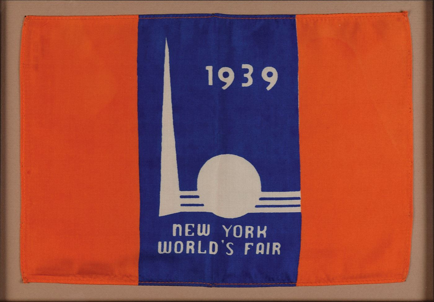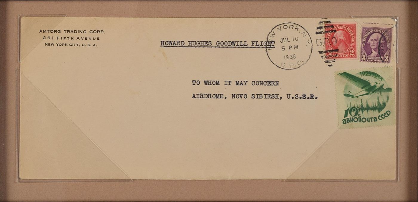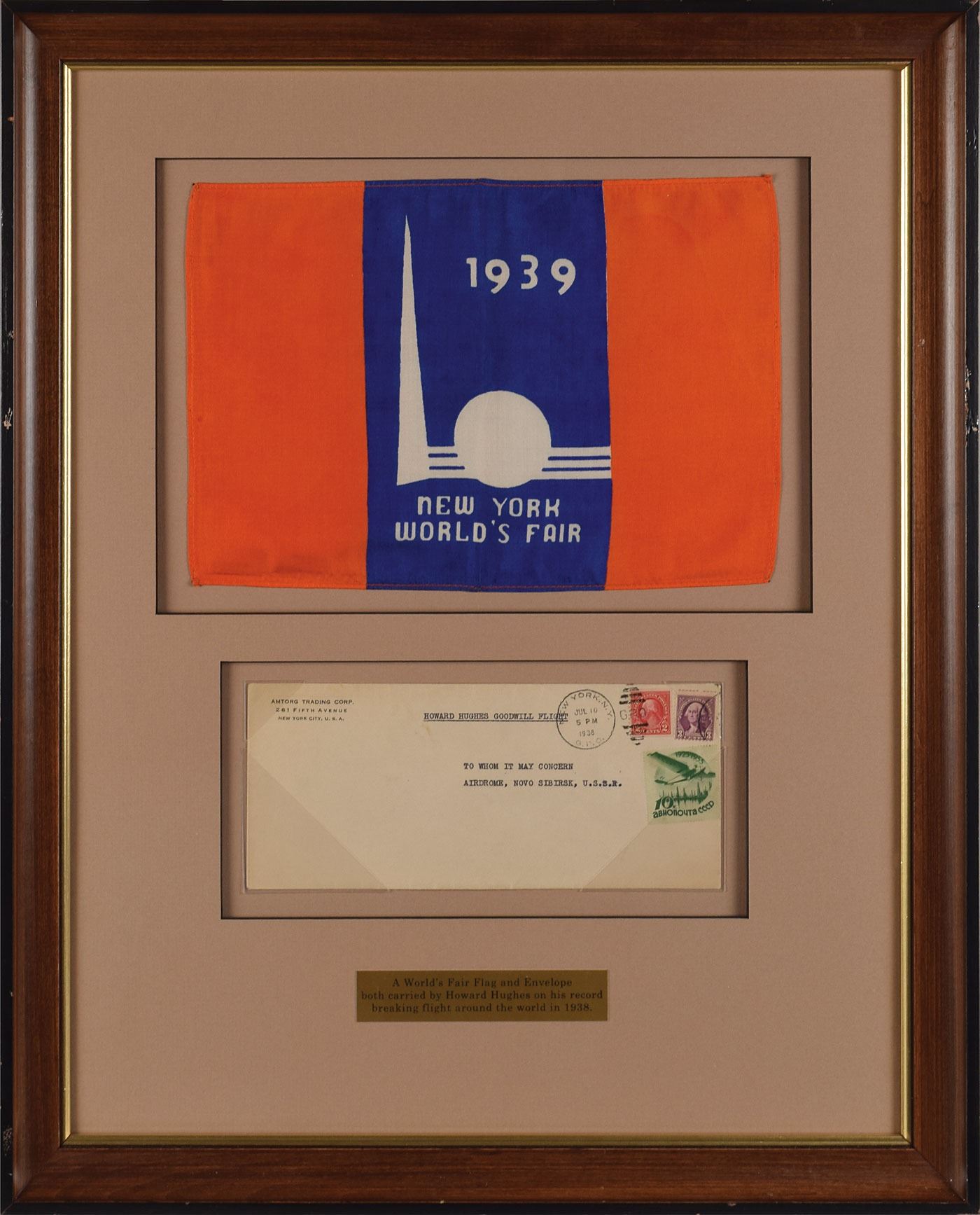Exceptional pairing of unsigned items flown on Howard Hughes's triumphant 1938 around-the-world flight: a superb large 12 x 8 silk flag for the 1939 New York World's Fair carried on the historic flight; and a scarce flown commemorative airmail postal cover, 9.5 x 4, addressed in type, "Howard Hughes Goodwill Flight, To Whom It May Concern, Airdrome, Novo Sibirsk, U.S.S.R.," and postmarked at New York on their take-off date of July 10, 1938. The flag and cover are handsomely mounted, matted, and framed with a plaque to an overall size of 19 x 24. In overall fine condition.