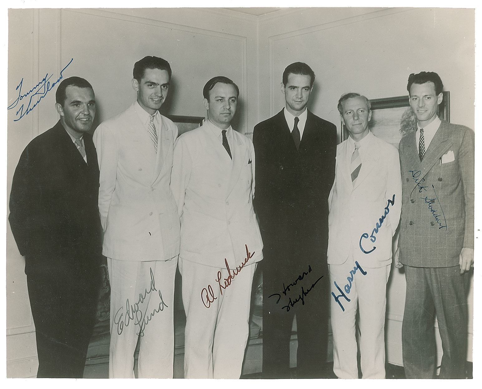 Exquisite vintage glossy 9.5 x 7.5 photo of Howard Hughes with the crew from his 1938 flight around the world, signed in fountain by all pictured: Howard Hughes, crew members Harry Connor, Tommy Thurlow, Dick Stoddard, and Edward Lund, and operations manager Al Lodwick. In fine condition. Though covers signed by this group are sometimes seen, signed photos are very rare.