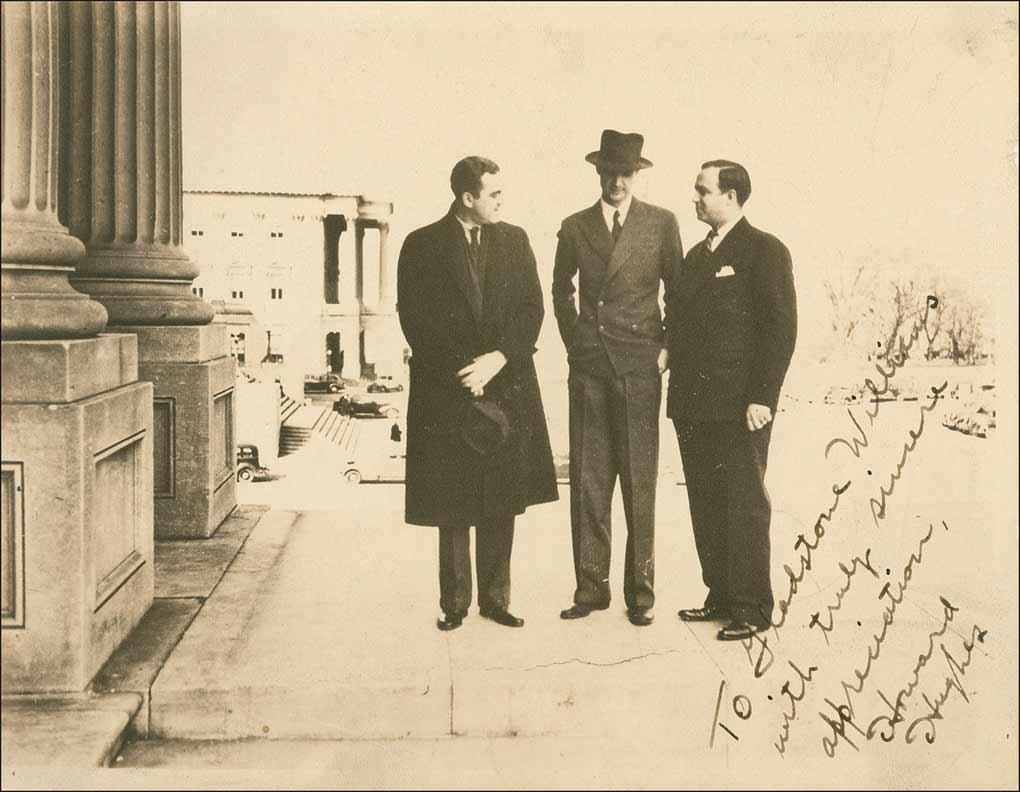 Vintage matte-finish 9.5 x 7.5 photo of Hughes in front of a building with Albert Lodwick and Gladstone Williams, signed and inscribed in fountain pen “To Gladstone Williams, with truly sincere appreciation, Howard Hughes.” Accompanied by a 5 x 4 matte-finish candid photo of Hughes, and apparently the same two gentleman, in a car during a Broadway ticker-tape parade, and a Howard Hughes 1939 World’s Fair air mail envelope. Lightly trimmed edges, some scattered light soiling, and a crack underneath Hughes’s feet, affecting only the background, otherwise fine condition.