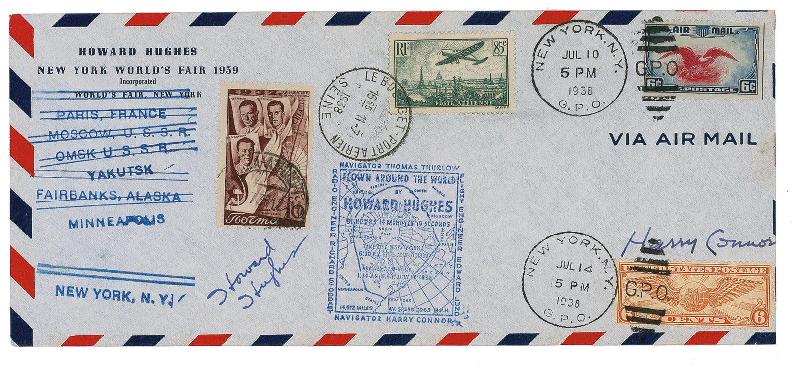 Rare flight-flown commemorative cover, 9.75 x 4.5, carried by Hughes on his 1938 trans-global flight, bearing several stamps and postmarks from various stops on his three day trip: Paris; Moscow, Omsk, Yakutsk (in the Soviet Union); Fairbanks, Alaska; Minneapolis, and New York. Signed on the front in blue ink by both Hughes and co-pilot Harry Connor. In fine condition, with tip of one postal cancellation touching the beginning of Connor’s signature.
