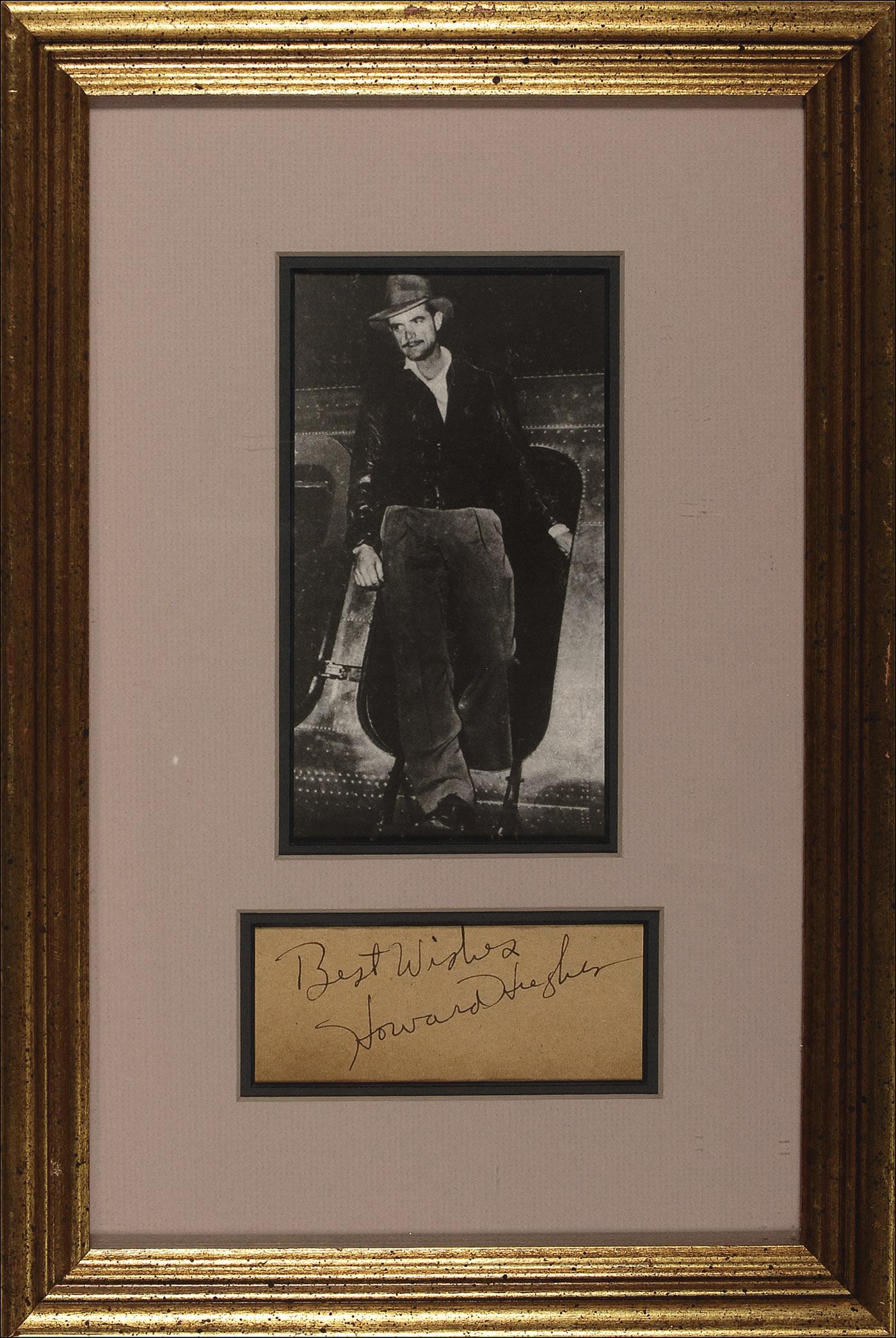 Fabled billionaire Industrialist, filmmaker, and aviator (1905–1976) who takes a place among the most colorful personalities of the twentieth century. Known as much for his prolific womanizing (his romantic partners included screen legends Jean Harlow and Katharine Hepburn, among others) as for his record-setting aviation exploits and business acumen, Hughes settled into reclusiveness in his final decades, disappearing from view and seeking refuge in closely guarded havens in Las Vegas, the Bahamas, and elsewhere. His enigmatic persona has remained an evergreen source of fascination more than a quarter century after his death, as evidenced by the fictional portrayals of him in the Oscar-winning films Melvin and Howard (1980) and The Aviator (2004). Vintage ink signature, “Best wishes, Howard Hughes,” on an off-white 4.75 x 2 slip. Double matted and framed with a portrait of Hughes exiting an airplane, to an overall size of 10.75 x 16. Moderate uniform toning, a bit heavier along bottom, and a few wrinkles and creases, otherwise fine condition. Hughes’s signature is exceptionally large and bold. Pre-certified PSA/DNA and RRAuction COA.