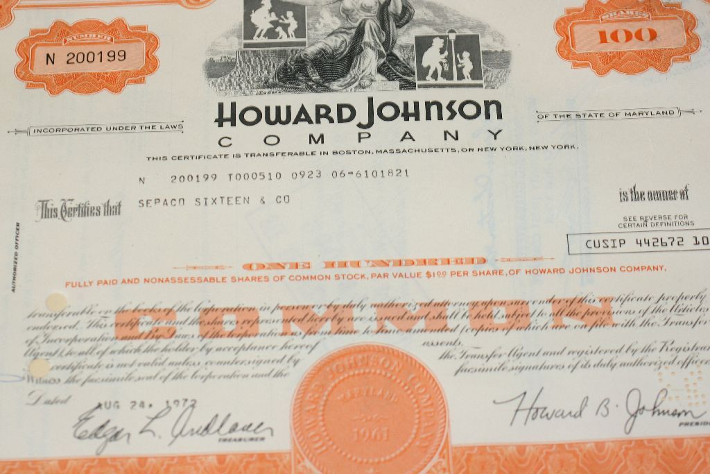 Howard Johnson Co. Stock Certificate dated 1972