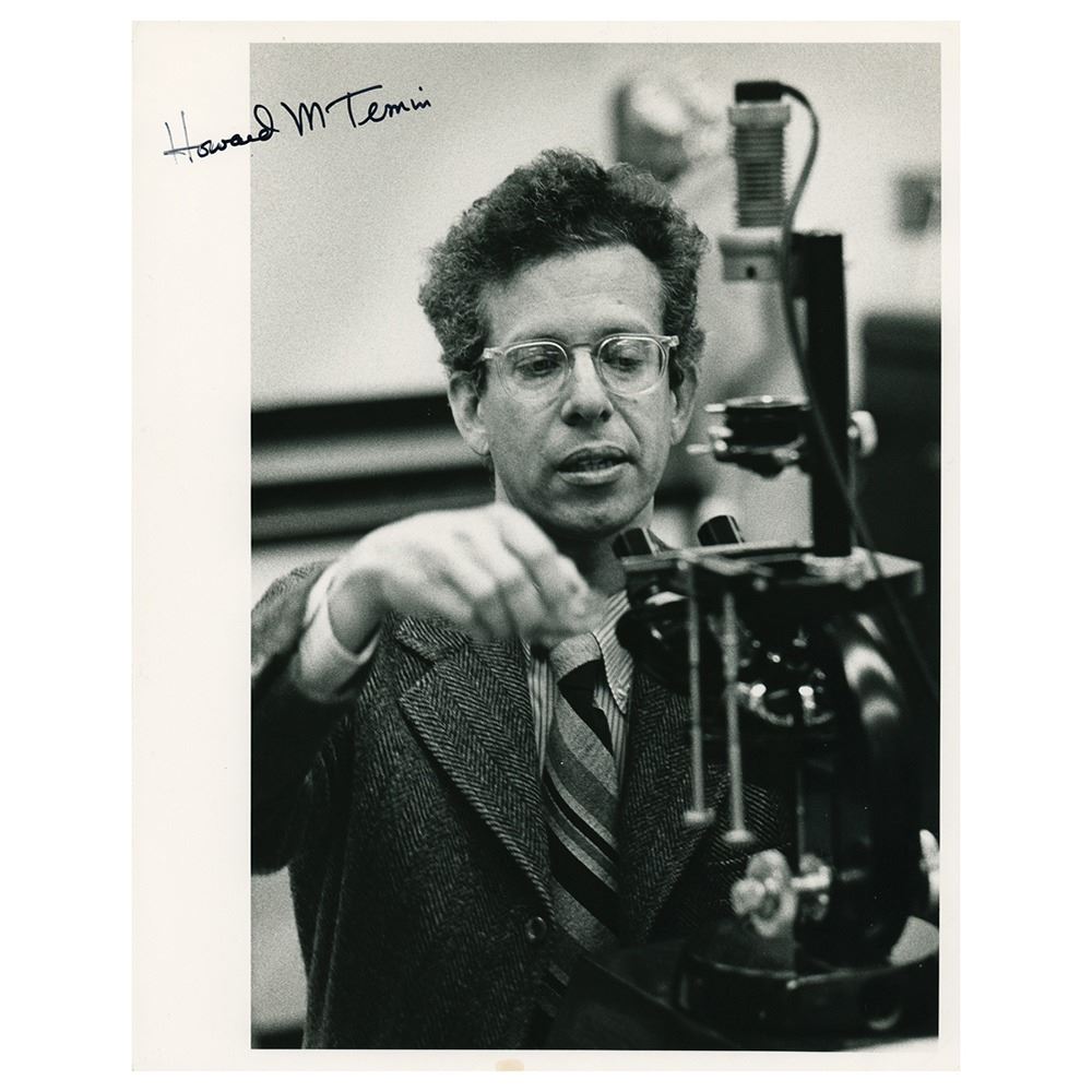 American geneticist and virologist (1934–1994) who shared the 1975 Nobel Prize in Physiology or Medicine for his discovery of reverse transcriptase. Glossy 8 x 10 photo of Temin working with a microscope, signed in black felt tip. Reverse bears an A. Craig Benson credit stamp. In fine condition, with a few small surface creases.