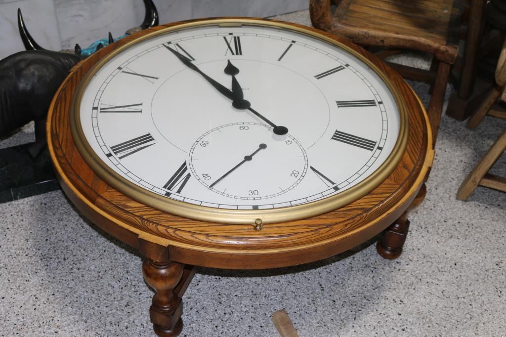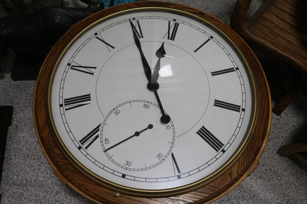Round oak case clock with four legs. 43" diameter, 17" tall. May also be hung on the wall.