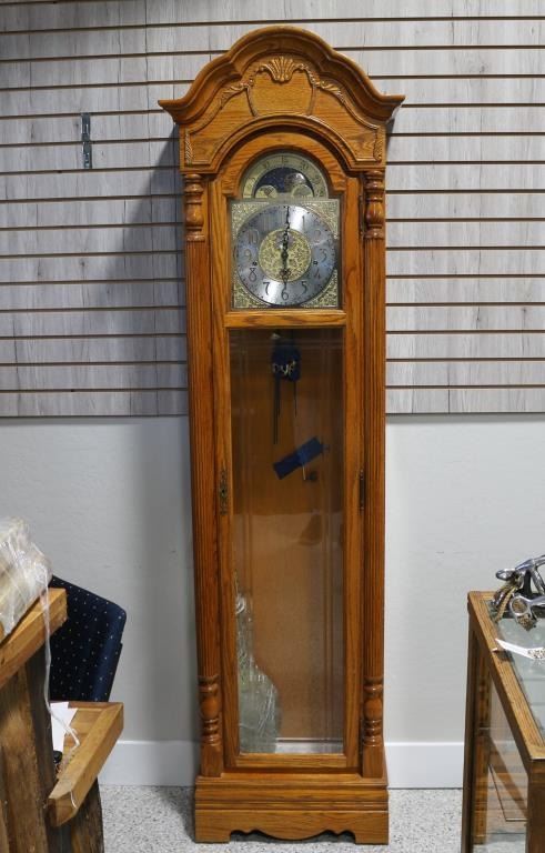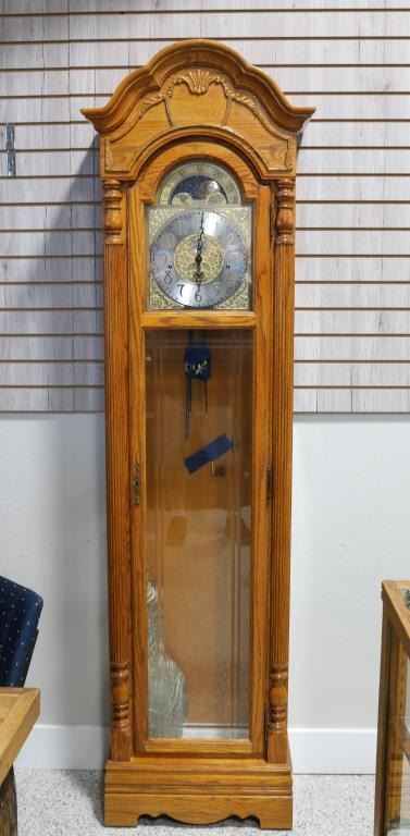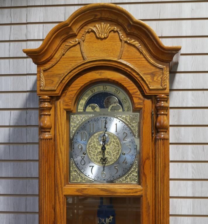 Made of honey oak with brass face. Model No. 610-754. Serial No. F0103690047. Measures 6'11" tall, 19" wide, 11 1/2" deep. In working condition.