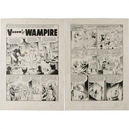 <B>Howard Nostrand - Flip #1, Complete 5-page Story "V...for Wampire" Original Art (Harvey, 1954).</B></I> Real vampires aren't born, they're made -- at good old Vampire U. Pretty Vanessa just wants to do her "field work" and graduate, but she can't seem to find a real man to have a "drink" with. Done in a brilliant parody of Jack Davis and Wally Wood's humor stylings, Howard Nostrand gives this story just the right touch of creepiness. Each page has an image area of 12" x 18", and the art is in Excellent condition.<BR><BR><b>Shipping:</b> Flat Material, Small (<a target="_blank" href="http://www.heritageauctions.com/common/shipping.php">view shipping information</a>)