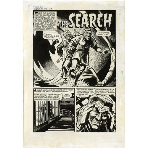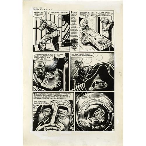 <B>Howard Nostrand - Tomb of Terror #8, Complete 6-page Story "The Search" Original Art (Harvey, 1953).</B></I> A blood clot in his brain sends murderer Ricky Slate to the emergency room. Was it the sickening cloyish fumes of the anesthesia, or was it his own drive to find his lost soul that drove him to "The Search"? Fine line work and layout by Howard Nostrand highlight this stellar selection of art. Each page has an image area of 12" x 18". There is some overall aging apparent; otherwise, the pages average in Very Good condition.