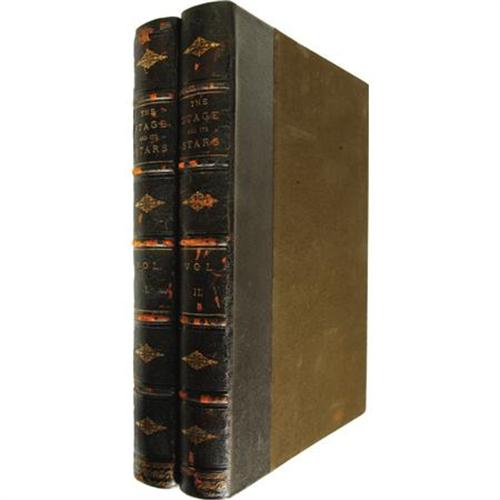 <B>Howard Paul and George Gebbie, </B></I><B><I>The Stage and Its Stars,</B></I></B></I> <B><I>Past and Present: A Gallery of Dramatic Illustration and Critical Biographies of Distinguished English and American Actors from the Time of Shakespeare Till Today</B></I></B></I> (Philadelphia: Gebbie and Co., Publishers, undated), in two volumes, 104 and 112 pages, respectively, 500-plus illustrations, quarter-leather and cloth binding, folio (11.75” x 16.5”), gilt edges. These two volumes include information and beautiful engravings of such stage luminaries as John Drew (maternal grandfather of Lionel, John and Ethel Barrymore), Edmund Kean, Junius Brutus Booth (father of actors Edmund and John Wilkes Booth), Richard Mansfield, Henry Irving, Richard Burbage, David Garrick, Tyrone Power, Sr., Sarah Bernhardt, Ellen Terry, Edmund Booth, and Maurice Barrymore (father of Lionel, John and Ethel Barrymore). This is a rare, beautiful set. Volume I is in very good condition with some wear to the leather spine, some tears on the half-title page, and a corner missing from the front blank page. Volume II is in very good condition with some wear to the leather spine.<BR><BR><b>Shipping:</b> Books & Catalogs (<a target="_blank" href="http://www.heritageauctions.com/common/shipping.php">view shipping information</a>)