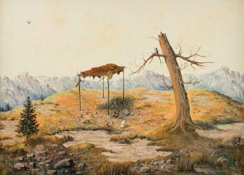 Howard Pepion (b. 1938). 32" x 44".Oil on Board. "Burial Ground". Signed LR. Dated 1968. (est $3,000-4,000). Provenance: MAC Museum, Spokane, Washington.