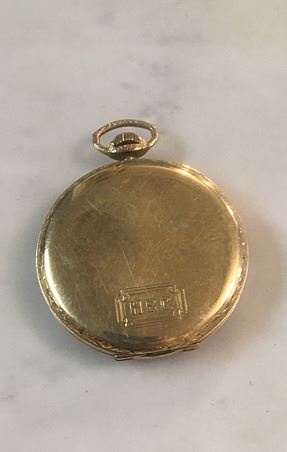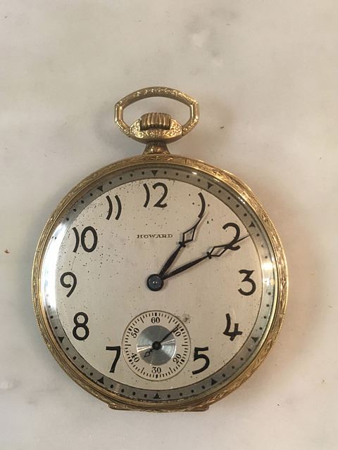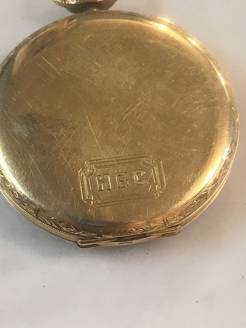 Howard Pocket watch with second dial, gold plate, monogrammed HBC on back.