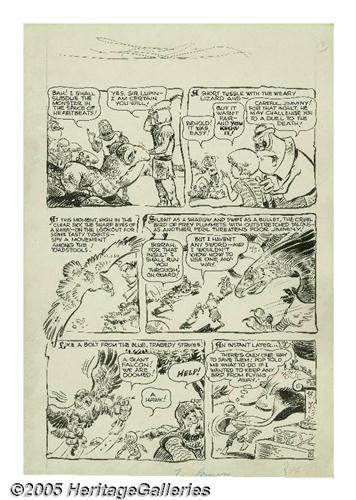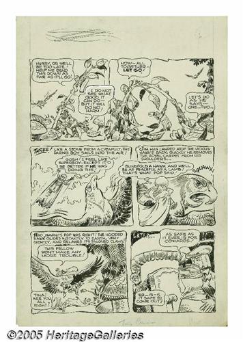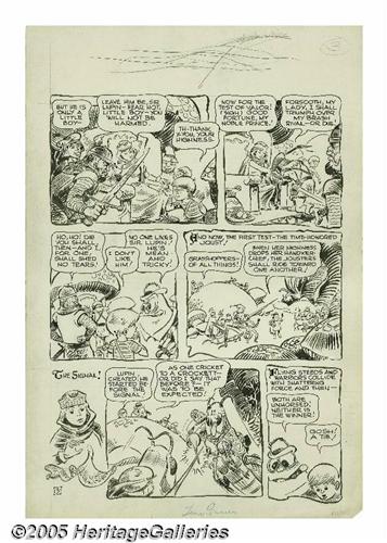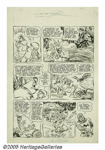 <B>Howard Post - More Fun Comics Complete 6-page Story, "The Winning of the Tiny Princess" Original Art (DC, 1947).</B></I> This incredible children's comic story looks so much like the work of Walt Kelly that, at first glance, it almost had several of our art experts fooled! Actually, it's by the very talented Howie Post, drawn during his brief tenure as primary artist for <B>More Fun Comics</B></I> in 1947. Post's series was entitled "Jimminy and the Magic Book"; that's Jimminy reading his fantastic book in the opening splash panel. Post's work so resembled Kelly's that the famous cartoonist offered Post a job as an assistant. That never happened, but Post did go on to become one of the top cartoonists for Harvey Comics in the early 1950s, drawing Spooky, Hot Stuff, and Little Audrey; in the late '60s, he returned to DC to create <B>Anthro</B></I>. We can't say for sure from which issue this story was published, if at all; as this was toward the end of <B>More Fun</B></I>'s run, it's possible this piece was never published. The pages of this story measure 15" x 22" with image areas of 13" x 18", and are all in Excellent condition save for a minor bit of soiling along the borders. Post art from this period is extremely hard to find; here's a choice example!