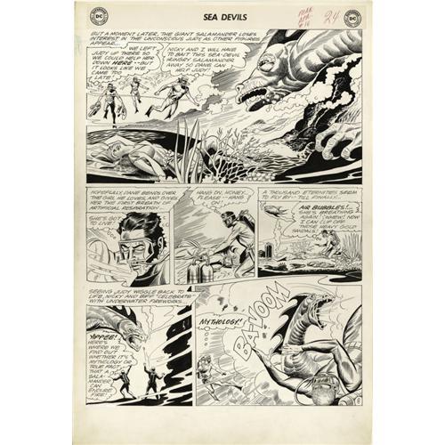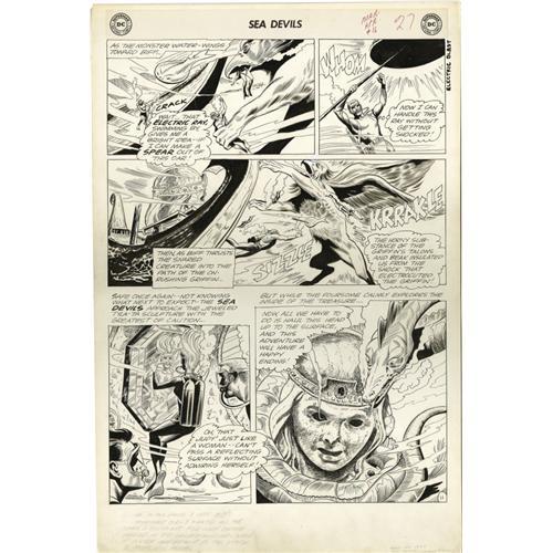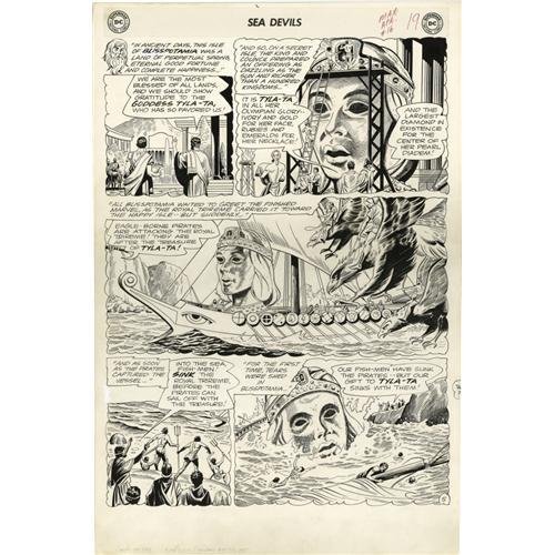 <B>Howard Purcell - Sea Devils #16 page 5, 8, and 11 Original Art (DC, 1964).</B></I> Howard Purcell had the unenviable job of following Russ Heath on <B>Sea Devils</B></I>, but rising to the challenge, he turned in a superb job. These three pages hail from "Sentinel of the Golden Head," and they showcase all four of the Sea Devils team members in action as they encounter mythological creatures -- griffins, a sea dragon, and even a cast idol head of the Blisspotamia goddess, Tyla-Ta. All in a day's work for the Sea Devils! The image area of each page measures approximately 13" x 19", and the art is in Excellent condition.