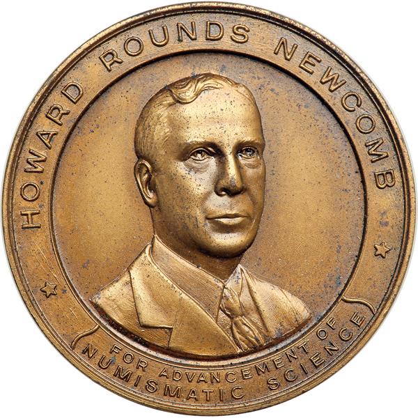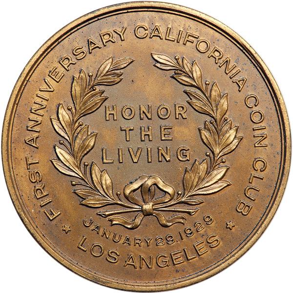 Howard R. Newcomb Medal from the California Coin Club January 29, 1929 MS60. A 38-millimeter medal struck in brassy-looking copper commemorating the first anniversary of the California Coin Club in Los Angeles. The obverse has a portrait of Howard Rounds Newcomb recognizing him "For Advancement of Numismatic Science".