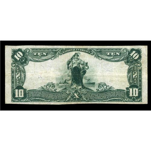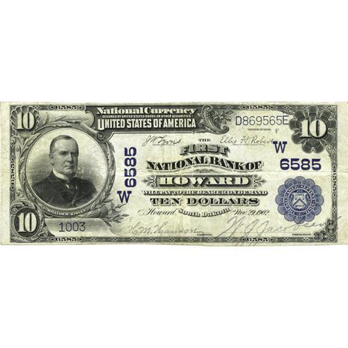 <B>Howard, SD</B></I> - $10 1902 Plain Back Fr. 624 <B>The First NB</B></I> Ch. # (W)6585<BR>This is one of only three examples known from this just plain rare bank, which issued only a mere handful of large notes before it disappeared back in 1925. We have long felt that this state is grossly undervalued, and notes such as this simply are further evidence of that fact. <B>Very Fine.</B></I>