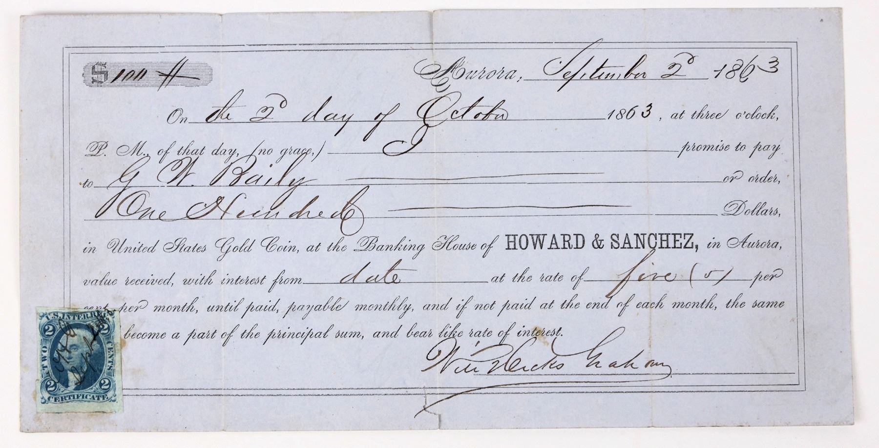 Exceptionally rare; likely unique. Dateline Aurora, September 2nd, 1863. Issued to GN Baily for $100/ Signed by Graham. Black print on blue paper. 4 x 8" This full-service but short-lived bank began operation when Aurora was still believed to be in Mono County, California rather than in Esmeralda County, Nevada. To avoid any confusion no mention of either state is present on this promissory note. Sanchez was also partnered with Van Wyck in an assay business, and the two eventually relocated to the Comstock.