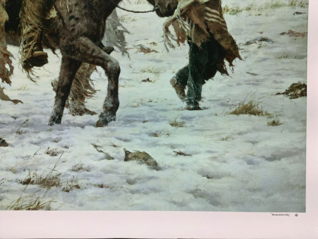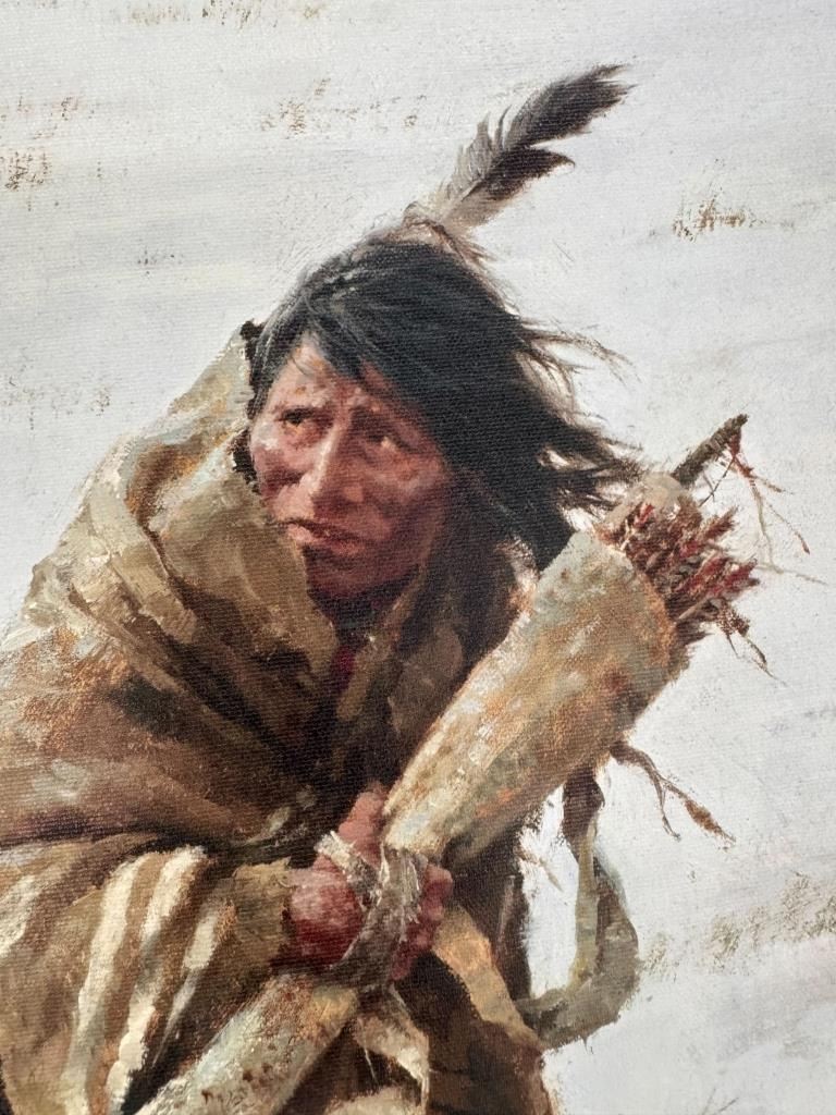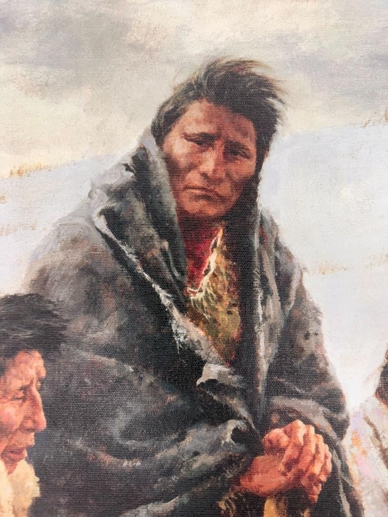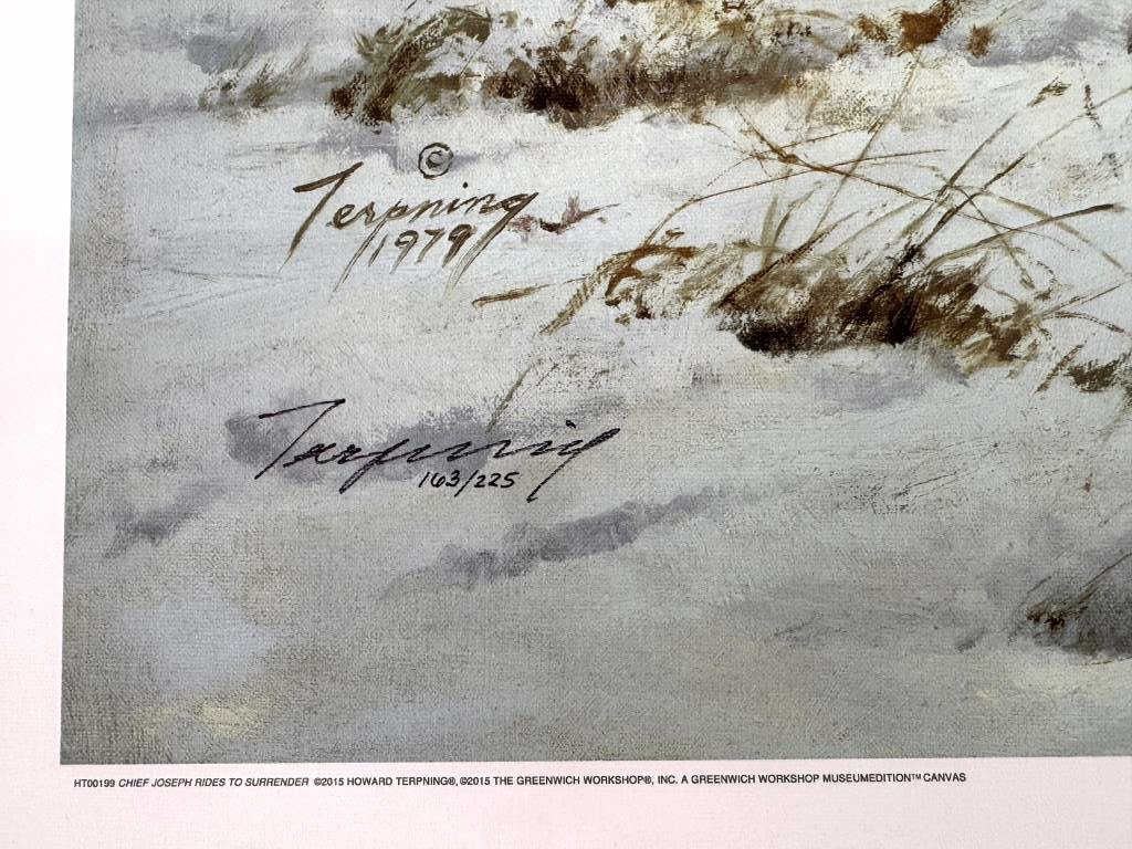 Featured in this lot is a Rare Signed Howard Terpning "Chief Joseph Rides To Surrender", Giclée on Canvas, Limited Edition, 163/225. "Chief Joseph Rides to Surrender" is a famous painting depicting the iconic moment in 1877 when the Nez Perce leader, Chief Joseph, rode to surrender his rifle to U.S. Army General Nelson Miles, ending the Nez Perce War near the Bear Paw Mountains in Montana and just short of safety in Canada. The wonderfully and professionally crafted Giclée on canvas artwork captures the profound sadness, dignity, and desperation of Chief Joseph and his people as their long, strategic retreat ended, marking the end of their traditional way of life, a poignant scene he memorialized with his famous words, "I will fight no more forever". Howard Terpning is an American painter and illustrator best known for his paintings of Native Americans. He is one of the most lauded painters of Western art. Over his lifetime he’s received the highest awards in the field, including the National Academy of Western Art’s Prix de West, the Hubbard Art Award for Excellence, the Lifetime Achievement Award from the Autry National Center, and 2005 Masters of the American West Thomas Moran Memorial Award and countless others. He’s an Emeritus member of the Cowboy Artists of America with over forty-one awards from that organization. Terpning's work can be found in museums including the Phoenix Art Museum, Gilcrease Museum, Booth Western Art Museum, National Portrait Gallery, and the Autry National Center of the American West. The Giclée on canvas is numbered, dated and signed on the bottom left corner. Giclée on canvas footer is labeled "Greenwich Workshop Museum Edition". The condition of this beautiful Giclée on canvas is wonderful with no obvious signs of damage and shows very nice overall condition. Measures 44"W x