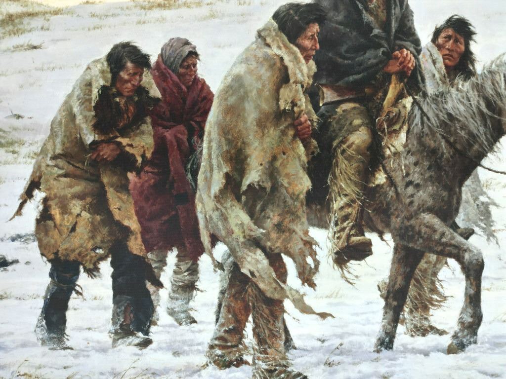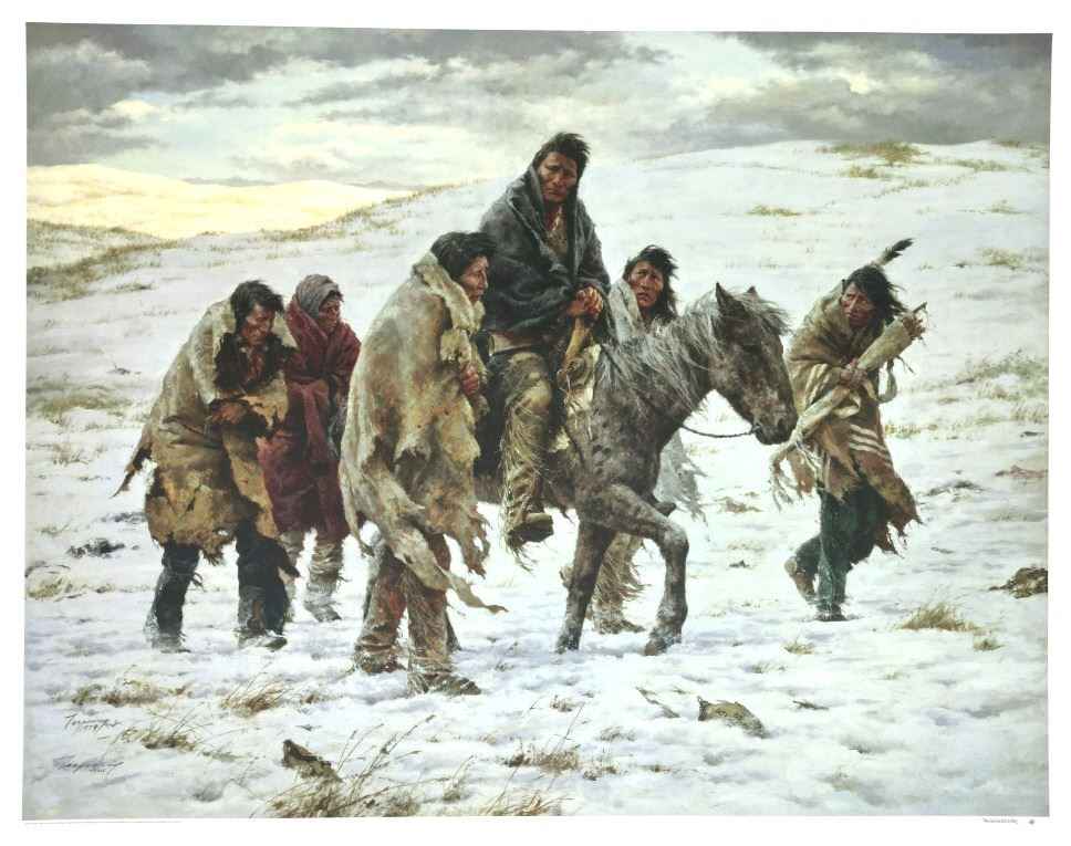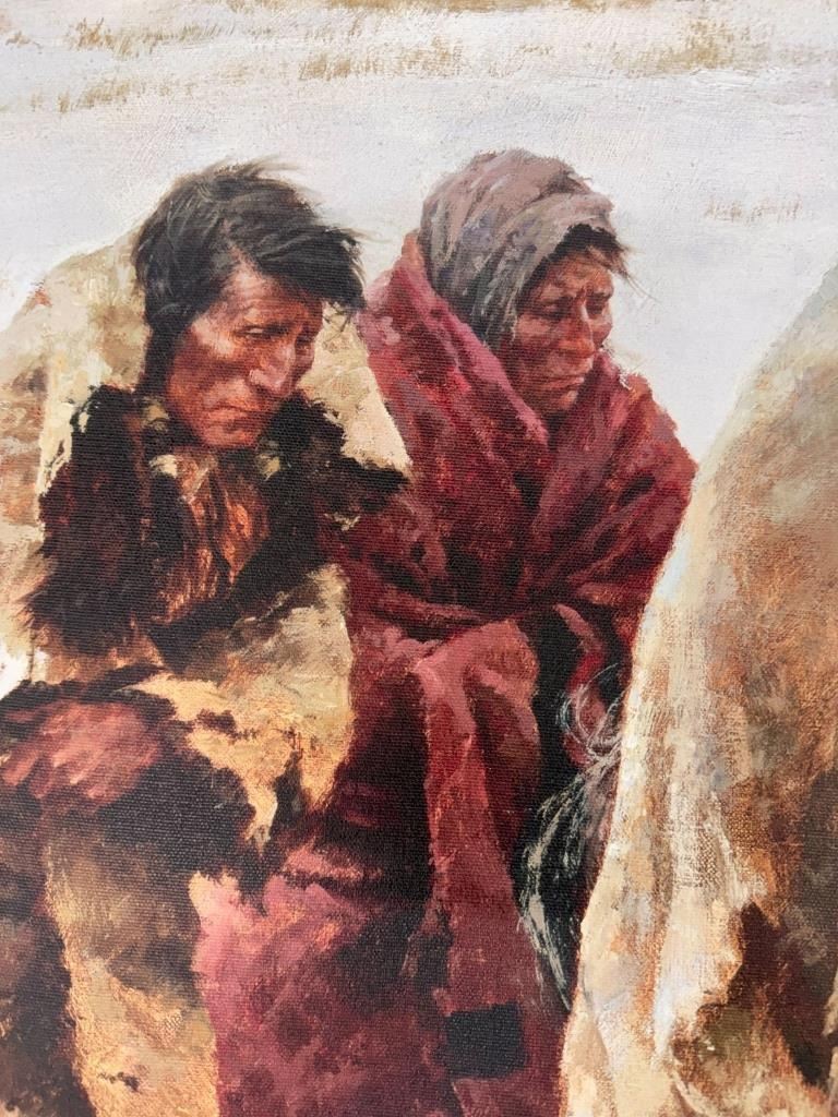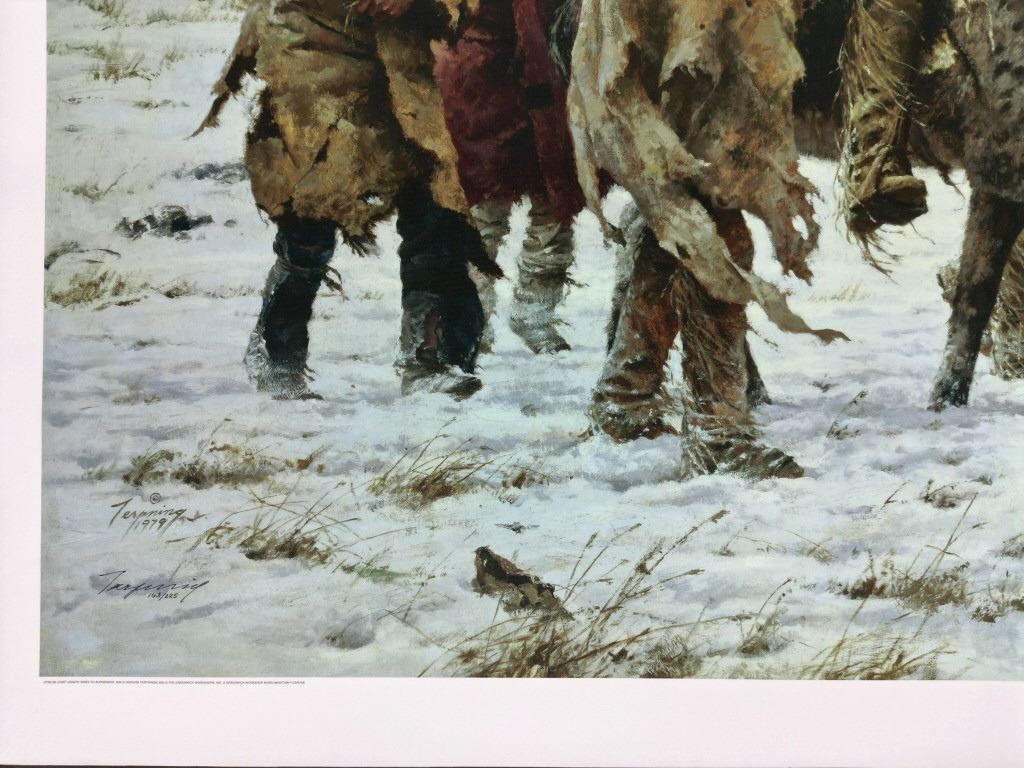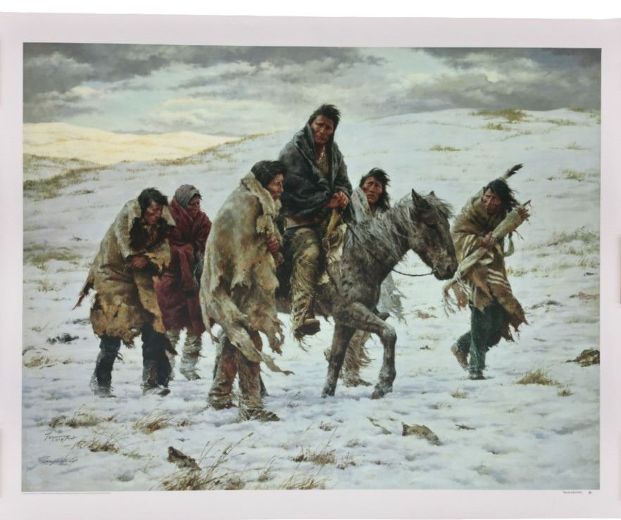 Featured in this lot is a Rare Signed Howard Terpning "Chief Joseph Rides To Surrender", Giclée on Canvas, Limited Edition, 163/225. "Chief Joseph Rides to Surrender" is a famous painting depicting the iconic moment in 1877 when the Nez Perce leader, Chief Joseph, rode to surrender his rifle to U.S. Army General Nelson Miles, ending the Nez Perce War near the Bear Paw Mountains in Montana and just short of safety in Canada. The wonderfully and professionally crafted Giclée on canvas artwork captures the profound sadness, dignity, and desperation of Chief Joseph and his people as their long, strategic retreat ended, marking the end of their traditional way of life, a poignant scene he memorialized with his famous words, "I will fight no more forever". Howard Terpning is an American painter and illustrator best known for his paintings of Native Americans. He is one of the most lauded painters of Western art. Over his lifetime he’s received the highest awards in the field, including the National Academy of Western Art’s Prix de West, the Hubbard Art Award for Excellence, the Lifetime Achievement Award from the Autry National Center, and 2005 Masters of the American West Thomas Moran Memorial Award and countless others. He’s an Emeritus member of the Cowboy Artists of America with over forty-one awards from that organization. Terpning's work can be found in museums including the Phoenix Art Museum, Gilcrease Museum, Booth Western Art Museum, National Portrait Gallery, and the Autry National Center of the American West. The Giclée on canvas is numbered, dated and signed on the bottom left corner. Giclée on canvas footer is labeled "Greenwich Workshop Museum Edition". The condition of this beautiful Giclée on canvas is wonderful with no obvious signs of damage and shows very nice overall condition. Measures 44"W x
