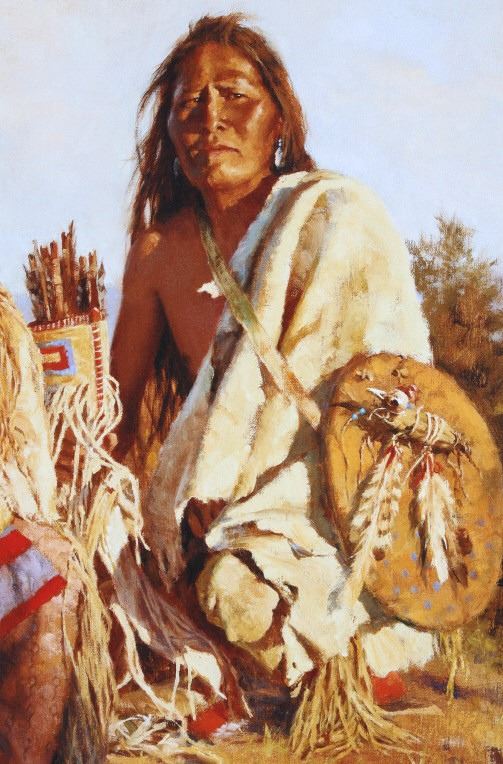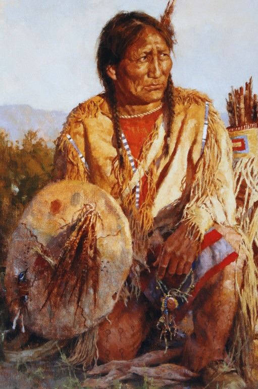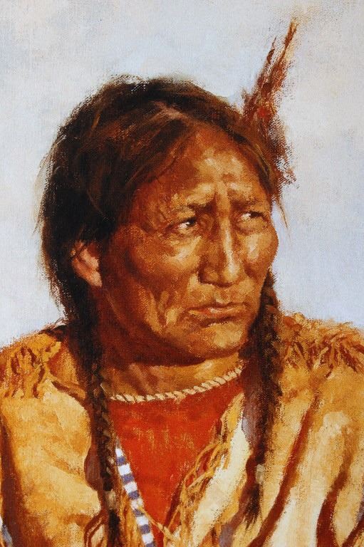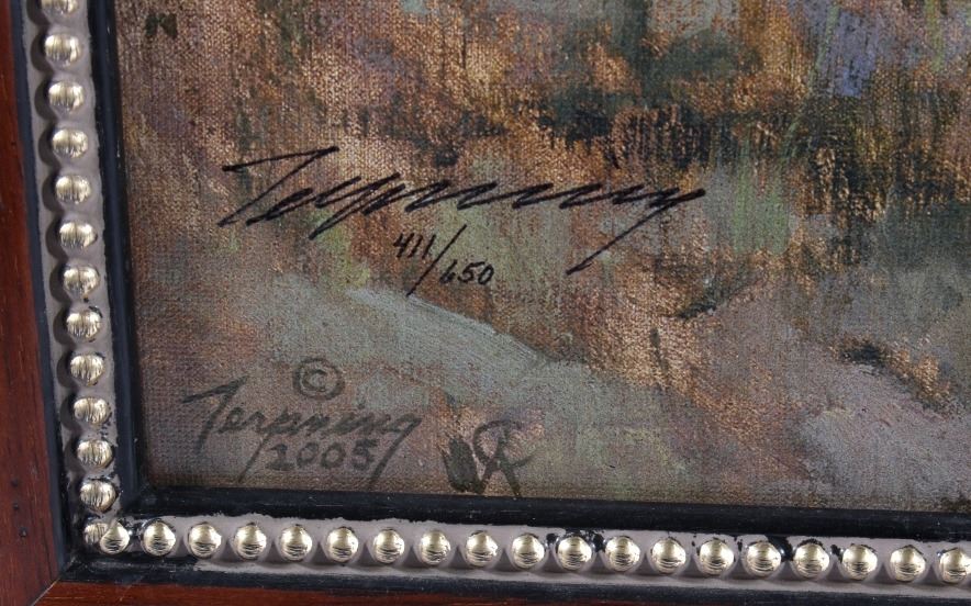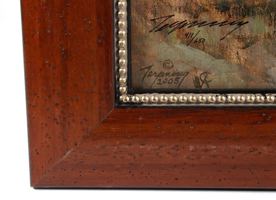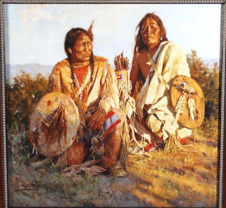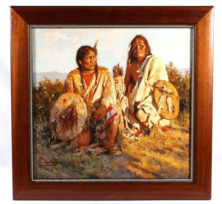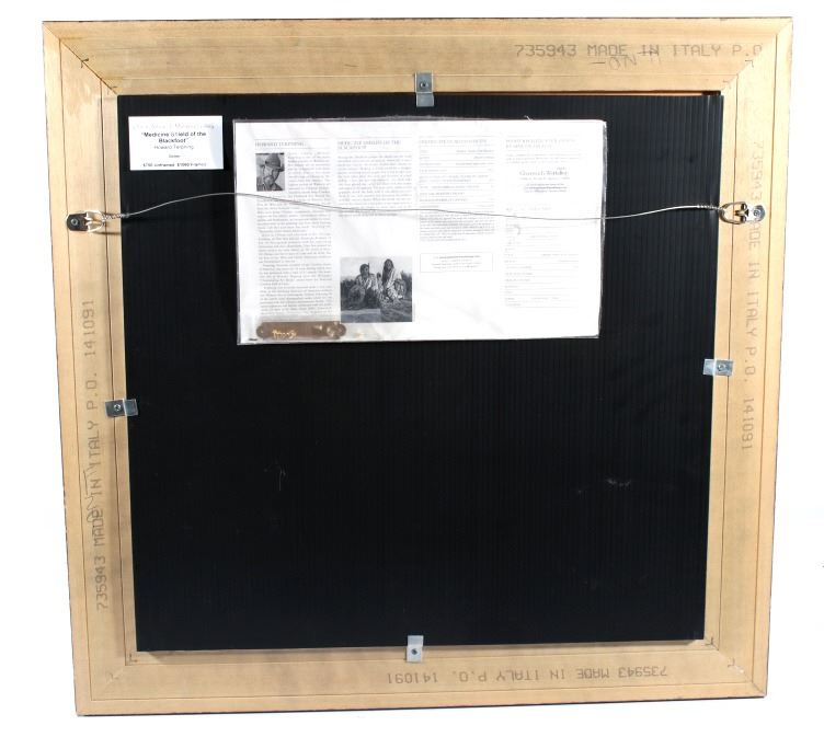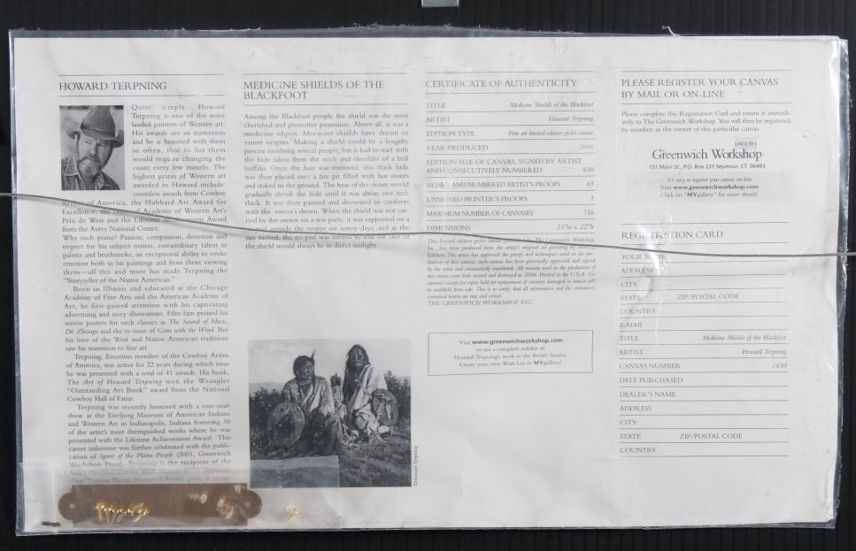 Featured in this lot we have a limited edition Giclee on canvas print by Howard Terpning titled "Medicine Shield of the Blackfoot". Howard Terpning is one of the most desired and notable Western artist of the 21st century and is known for is impressive depictions of the Native American Indian culture. Terpning is also a member of the Cowboy Artist of America and has won 60 awards in his field. The Giclee shows the image of two Blackfoot Native Americans crouching in the sunlight and holding shields. The piece is signed in the bottom left hand side and is marked 411 of 650 limited edition prints. The print is set into a custom wooden frame with a printed certificate of authenticity on the back of the frame. The Giclee shows good condition and wonderful detail. The frame measures 28 3/4" wide by 27 3/4" tall with the print measuring 22 1/2" wide by 21 1/2" tall.