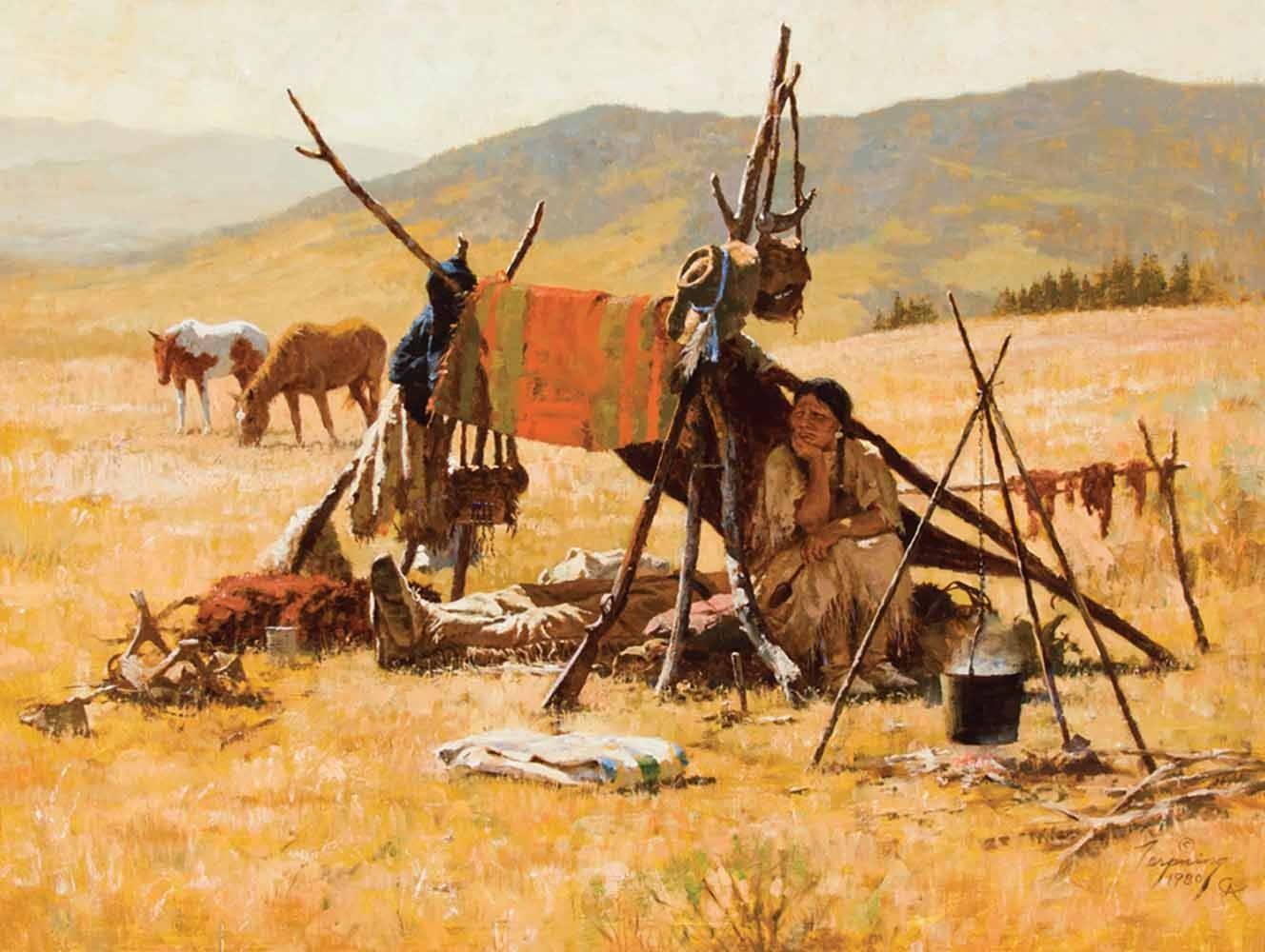 Howard Terpning b. 1927 Signed/CA lower right, dated 1980 Signed and titled verso 21 1/4 x 28 inches. Shipping: 33x40. Oil on board