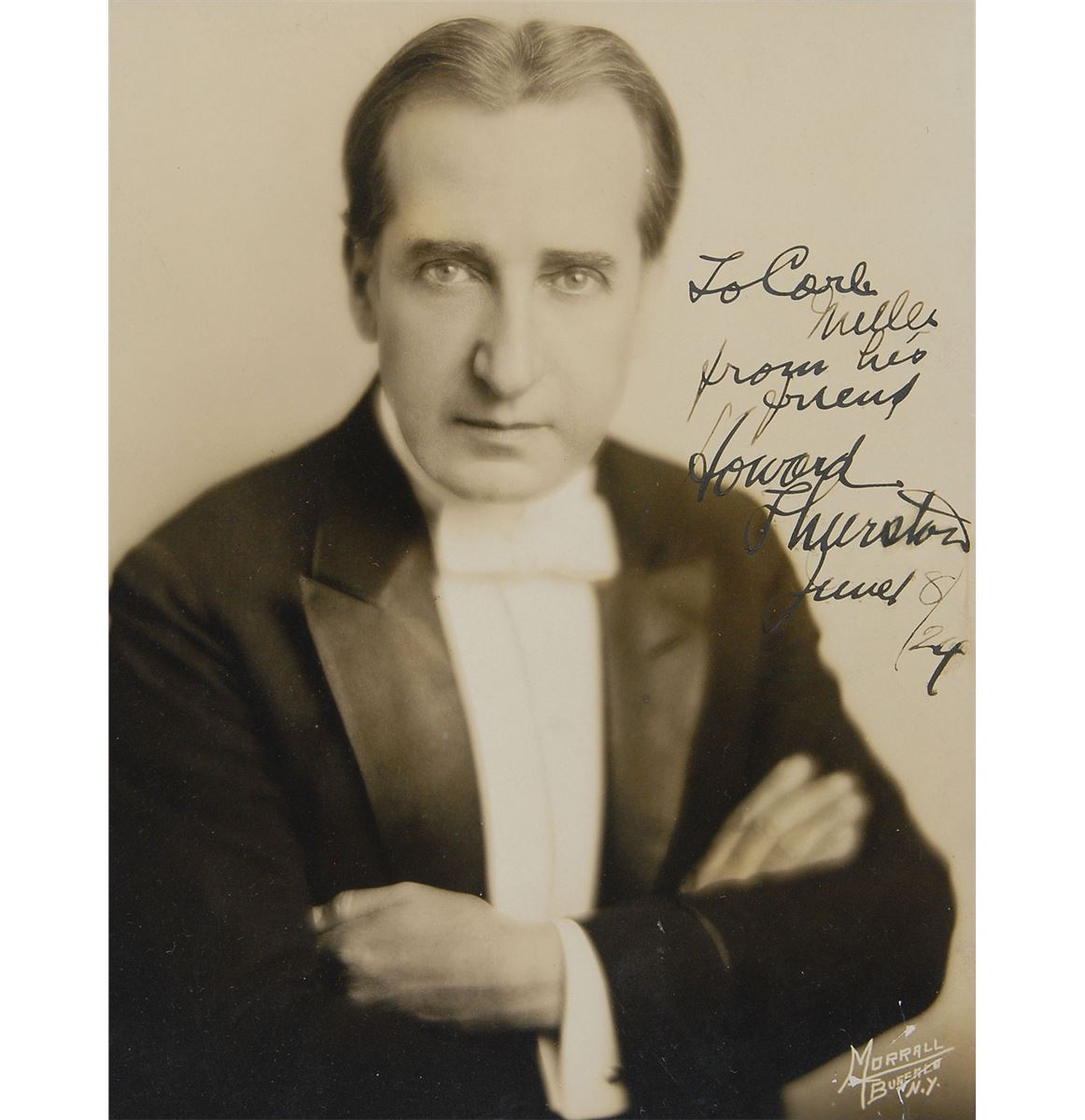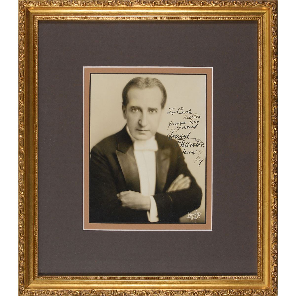 Stage magician from Ohio (1869–1936), whose enormous traveling magic show required eight train cars to transport his props across the country. Wonderful vintage pearl-finish 6.5 x 8.5 photo of Thurston published by New York’s Morrall photograpy, signed and inscribed in fountain pen, “To Carl Miller, from his friend, Howard Thurston, June 8/24.” Double-matted and framed to an overall size of 14.75 x 16.75. In fine condition, with a few surface marks to the bottom right corner. The James Collings Collection.