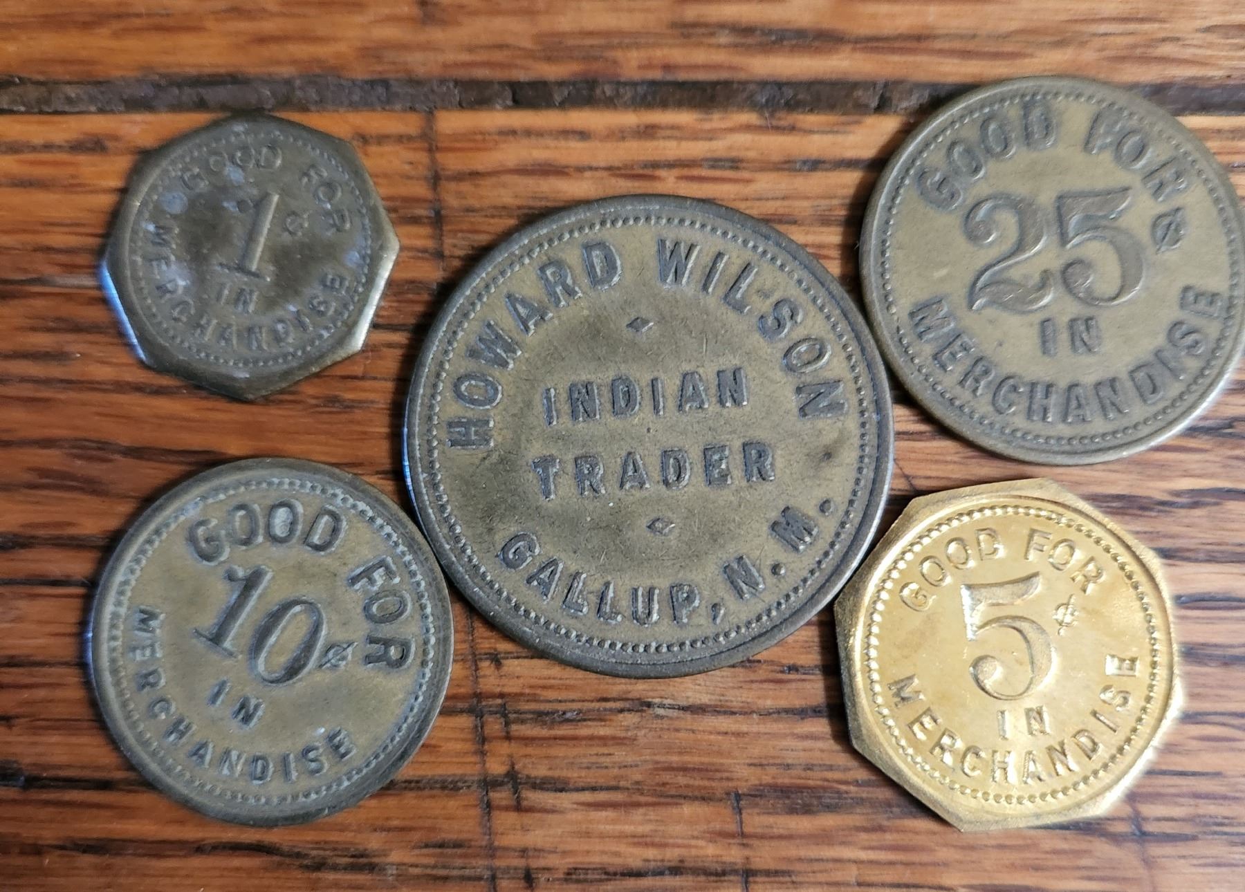 It is unusual to find a set of trade tokens from a single store. This set includes each of the tokens from Howard Wilson (1, 5. 10, amd 25-cent plus 1 dollar)