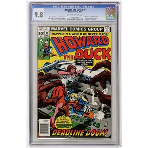 <B>Howard the Duck #16 (Marvel, 1977) CGC NM/MT 9.8 Off-white to white pages.</B></I> Album issue. Gene Colan cover. Artists include Dave Cockrum, John Buscema, Al Milgrom, and Terry Austin. CGC hasn't awarded a higher grade for this issue to date. Overstreet 2007 NM- 9.2 value = $4. CGC census 10/07: 5 in 9.8, none higher. <I> From the Fantastic Frank Collection.</B></I><BR><BR><b>Shipping:</b> Comics - Slabbed (certified) (<a target="_blank" href="http://www.heritageauctions.com/common/shipping.php">view shipping information</a>)