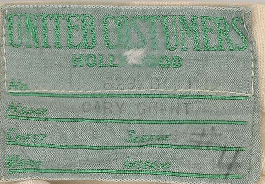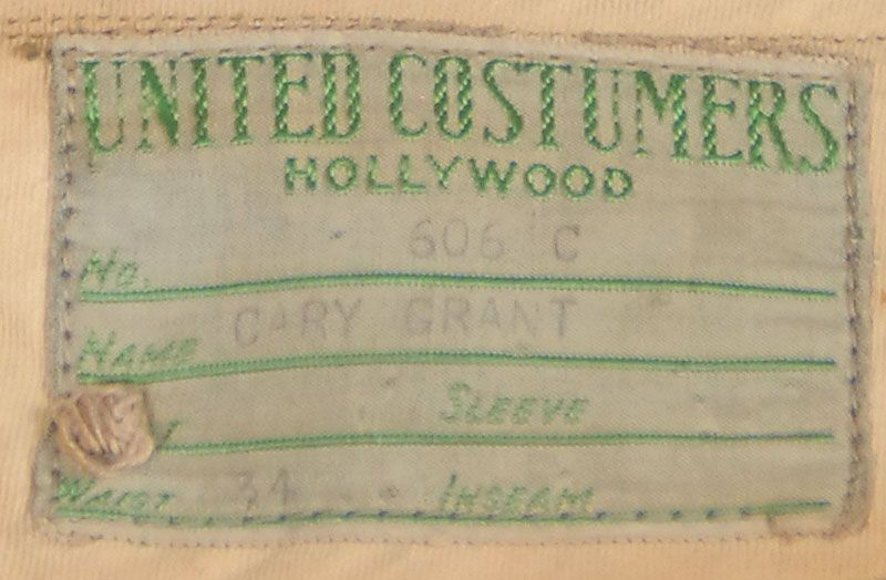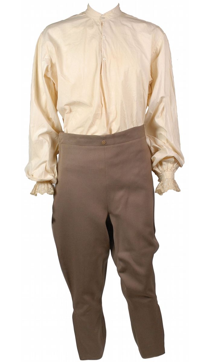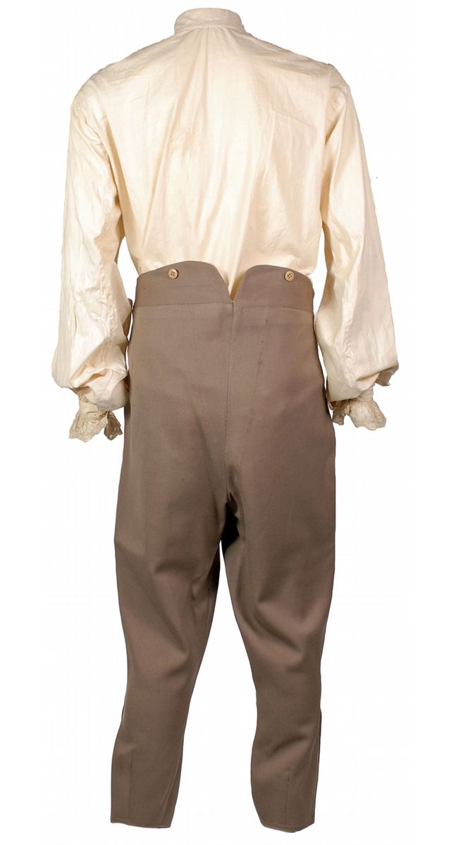 Screen-worn pants and breeches, worn by Grant as Matt Howard in the 1940 film The Howards of Virginia. The lightweight long-sleeve pullover shirt has ruffled lace cuffs, and a United Costumers label sewn into the lining, with Grant’s name typed on the second line, production number “629 D,” on the first line, and “#4,” written on the bottom. The inside of the shirt also bears a small “Clothes Gold,” stamp to the inside. Brown breeches have a zipper and button-up front and have another United Costumers label sewn to the inside, with Grant’s name typed on the second line, and production number “606 C,” typed on the first line. In fine condition, with some scattered wear and soiling to the pants.