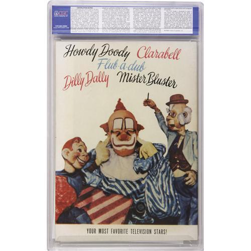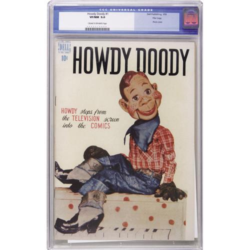 <B>Howdy Doody #1 File Copy (Dell, 1950) CGC VF/NM 9.0 Cream to off-white pages.</B></I> The television star debuts in his very own comic book. This first issue sports a photo cover of the children's favorite star and the back cover sports a group portrait of the TV show's co-stars. Furthermore, this scarce first issue is also comicdom's first TV comic. This is an exceptional copy of a historic book. Overstreet 2006 VF/NM 9.0 value = $1,207; NM- 9.2 value = $1,700. CGC census 10/06: 3 in 9.0, 3 higher.<BR><BR><b>Shipping:</b> Slabbed Comic (<a target="_blank" href="http://www.heritageauctions.com/common/shipping.php">view shipping information</a>)