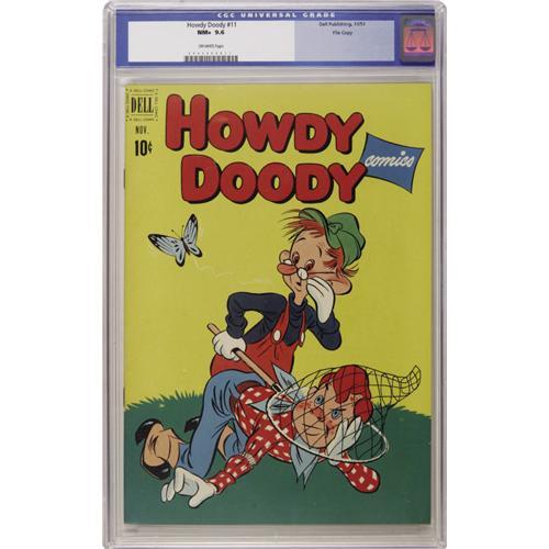 <B>Howdy Doody #11 File Copy (Dell, 1951) CGC NM+ 9.6 Off-white pages.</B></I> Howdy Doody is mistakenly caught in the net instead of a butterfly as Dilly Dally intended. This file copy is pretty darn nice and is one of three ranked as the highest CGC-graded copies to date. Overstreet 2006 NM- 9.2 value = $215. CGC census 10/06: 3 in 9.6, none higher.<BR><BR><b>Shipping:</b> Slabbed Comic (<a target="_blank" href="http://www.heritageauctions.com/common/shipping.php">view shipping information</a>)