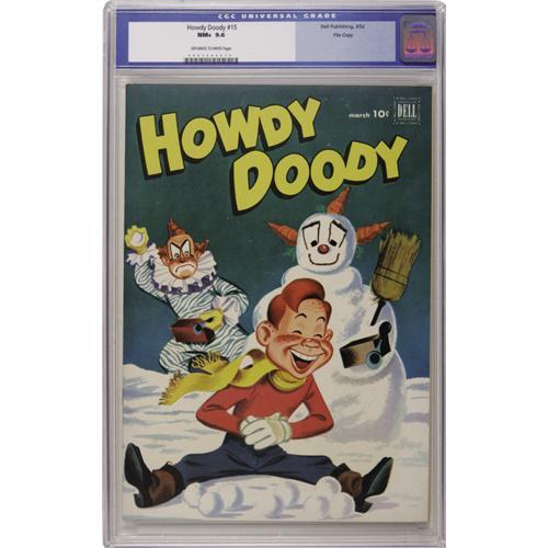 <B>Howdy Doody #15 File Copy (Dell, 1952) CGC NM+ 9.6 Off-white to white pages.</B></I> The comic that the Howdy Doody TV show spawned was no less fun than its source material, and just happens to be one of the earliest TV-based comic books. This copy is currently tied as the best CGC-certified copy of this issue in the census. Overstreet 2006 NM- 9.2 value = $215. CGC census 10/06: 2 in 9.6, none higher.<BR><BR><b>Shipping:</b> Slabbed Comic (<a target="_blank" href="http://www.heritageauctions.com/common/shipping.php">view shipping information</a>)