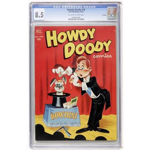 <B>Howdy Doody #16 File Copy (Dell, 1952) CGC VF+ 8.5 Off-white to white pages.</B></I> Painted cover. Overstreet 2007 VF 8.0 value = $94; VF/NM 9.0 value = $157. CGC census 12/07: 2 in 8.5, 1 higher.<BR><BR><b>Shipping:</b> Comics - Slabbed (certified) (<a target="_blank" href="http://www.heritageauctions.com/common/shipping.php">view shipping information</a>)