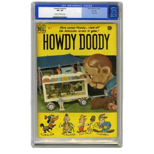 <B>Howdy Doody #2 File Copy (Dell, 1950) CGC VF+ 8.5 Cream to off-white pages.</B></I> This series was the first TV comic, and whether you were around in 1950 or not, you gotta love it! Only two copies of the issue have been graded higher by CGC to date. Overstreet 2005 VF 8.0 value = $305; VF/NM 9.0 value = $478. CGC census 12/05: 1 in 8.5, 2 higher.
