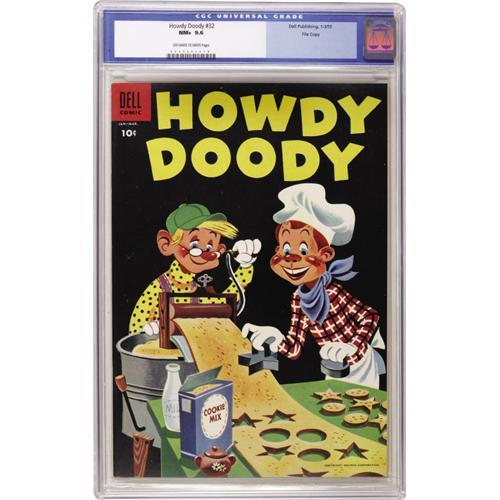<B>Howdy Doody #32 File Copy (Dell, 1955) CGC NM+ 9.6 Off-white to white pages.</B></I> Anyone know what time it is? For Howdy and his pal Dilly Dally, it's time to make the cookies! This lovely black cover copy looks extra fresh and glossy. Little wonder it's currently at the head of the CGC census for this issue! Overstreet 2006 NM- 9.2 value = $175. CGC census 10/06: 1 in 9.6, none higher.<BR><BR><b>Shipping:</b> Slabbed Comic (<a target="_blank" href="http://www.heritageauctions.com/common/shipping.php">view shipping information</a>)
