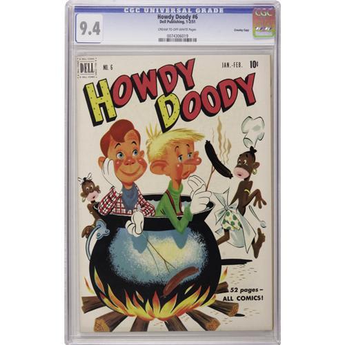 <B>Howdy Doody #6 Crowley Copy pedigree (Dell, 1951) CGC NM 9.4 Cream to off-white pages.</B></I> This book is noted as having a "classic" cover and one gander at the racist depiction of natives and you'll know why. This comic was cited in the <B>Seduction of the Innocent</B></I> and it states, in part, "The book depicts colored natives as stereotyped caricatures, violent, cowardly, cannibalistic and so superstitious...." This is the highest graded copy certified by CGC to date. Overstreet 2006 NM- 9.2 value = $400. CGC census 10/06: 1 in 9.4, none higher.<BR><BR><b>Shipping:</b> Slabbed Comic (<a target="_blank" href="http://www.heritageauctions.com/common/shipping.php">view shipping information</a>)