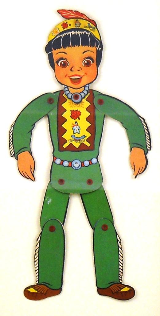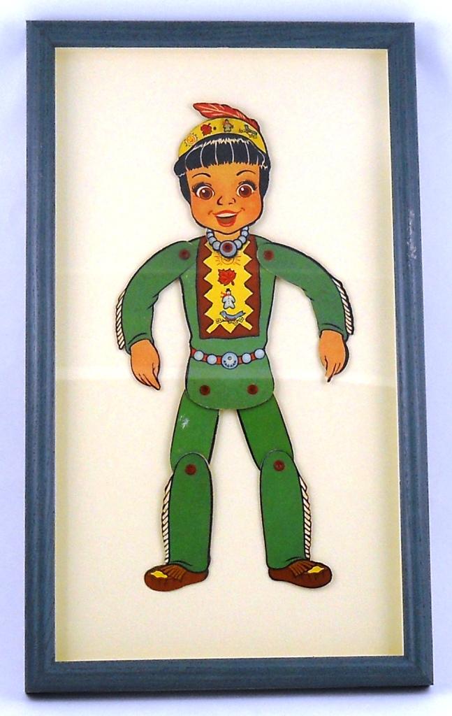 This is a jointed cardboard puppet of Princess Summer, Fall, Winter, Spring from the Howdy Doody Show. Wonder Bread gave these away in the 50's. Some of these puppets were holding a loaf of bread and some were not. This one did not, as there are no staple holes in her hands. This is in excellent condition and is about 12-½ inches tall x 6 inches wide; the frame is 17 inches x 10 inches.