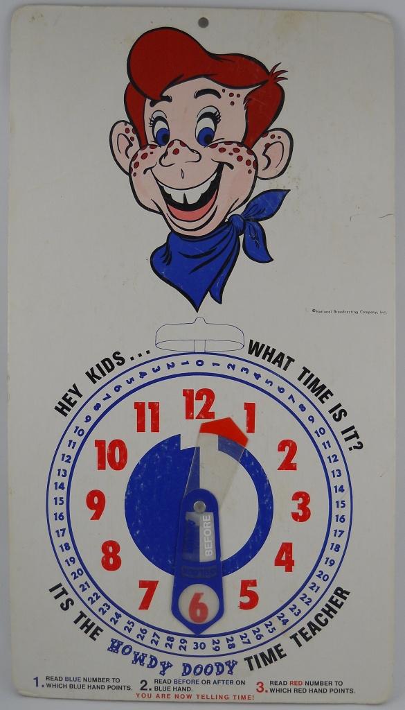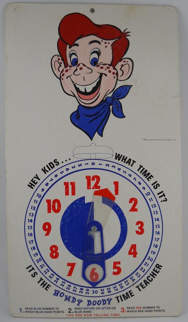 Learn how to tell time with the Howdy Doody Time Teacher. This nostalgic educational toy plays on the opening line of the Howdy Doody show "Hey Kids. . . What Time Is It?" (to which the kids at home and in the peanut gallery responded "It's Howdy Doody Time").