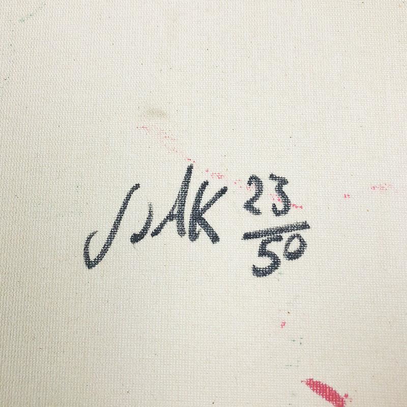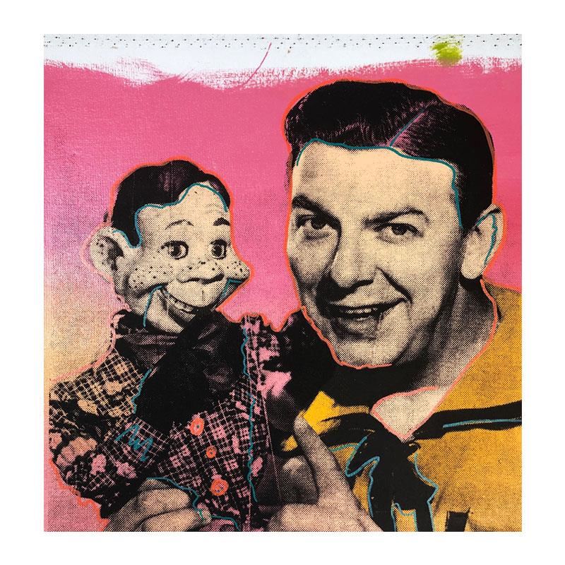 "Howdy Doody" is a limited edition hand pulled silkscreen mixed media on canvas by Andy Warhol protege Steve Kaufman (1960-2010). This piece is numbered and 23/50 and hand signed inverso. Includes letter of authenticity. As is common with Kaufman's works, this piece may have perceived minor flaws, but is in overall good condition. Measures approximately 17" x 17" (image).