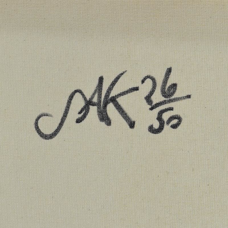"Howdy Doody" is a hand painted, hand pulled limited edition silkscreen on canvas by Andy Warhol protege, Steve Kaufman (1960-2010). This piece is Numbered 26/50 and hand signed inverso by the artist. This piece comes gallery wrapped. As is common with Kaufman's works, this piece may have perceived minor flaws, but is in overall good condition. Measures approx. 14" x 15" (image).