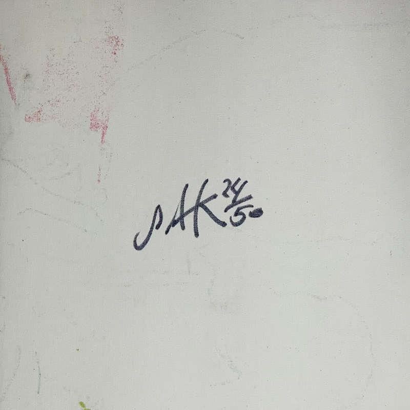 "Howdy Doody" is limited edition hand pulled silkscreen unique mixed media on canvas by Andy Warhol protege Steve Kaufman (1960-2010). This piece is numbered and hand signed inverso and includes a letter of authenticity. As is common with Kaufman's works, this piece may have perceived minor flaws, but is in overall good condition. Measures approximately 17" x 17" before cropping.