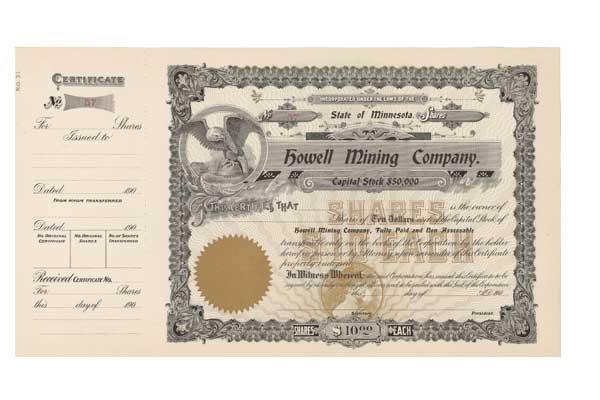 Stock certificates from the United States and other countries around the world. Items offered cover a wide variety of collecting topics including automotive, railroads, mining, autographed and much more.