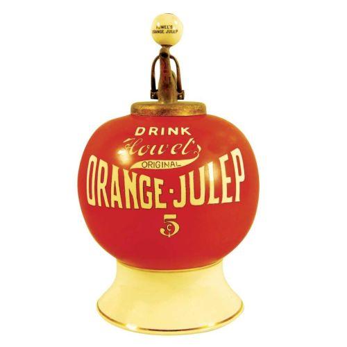 Howels Orange Julep Syrup Dispenser, with original pump. No chips or cracks. Excellent original condition. 15 1/2 inches tall.