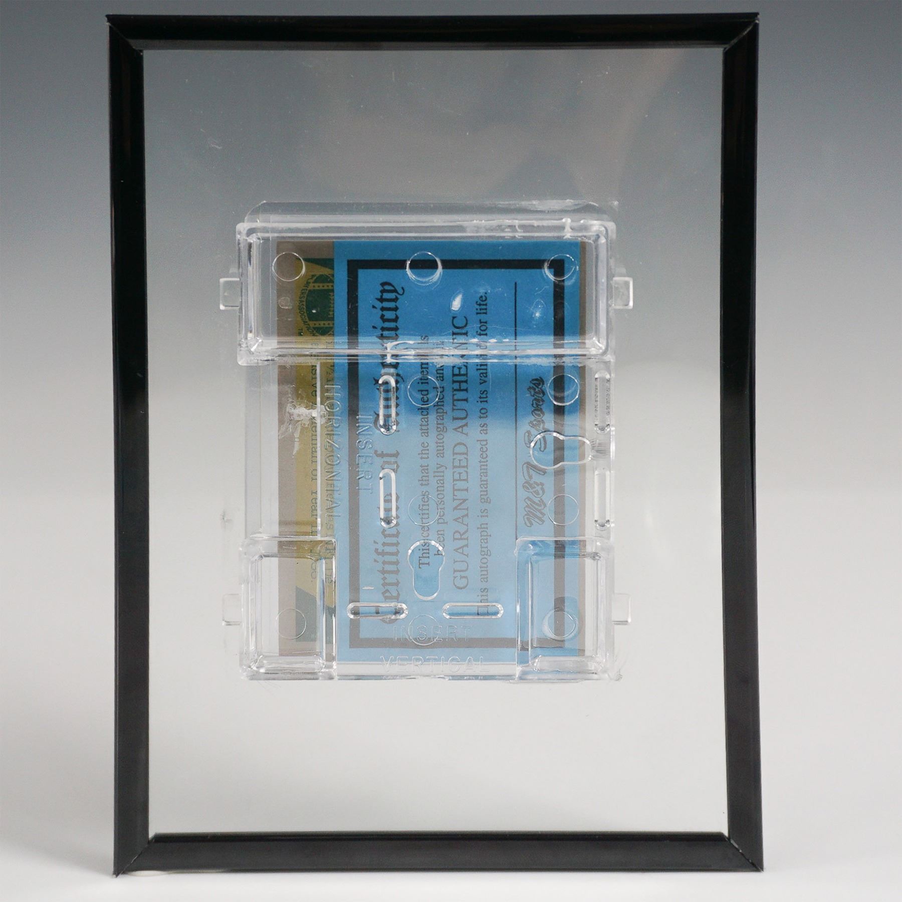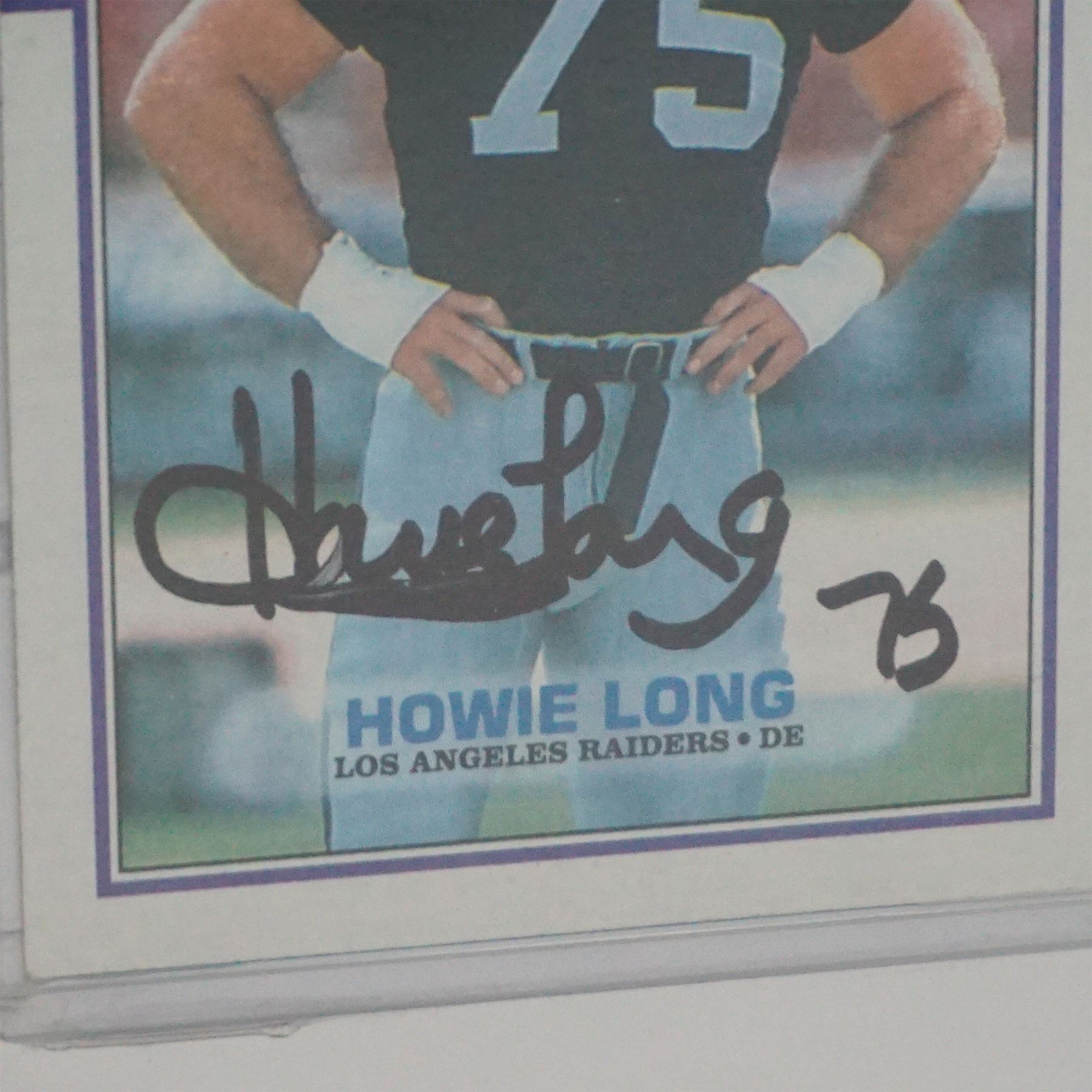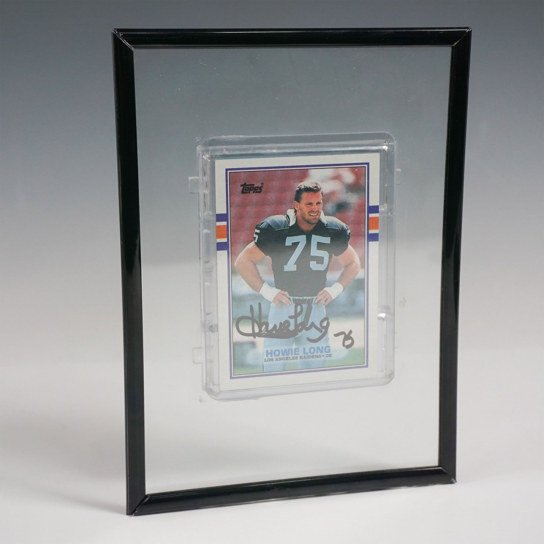 This Topps football card features Howie Long, the legendary defensive end for the Los Angeles Raiders. The card showcases Long in his Raiders uniform and is personally signed in bold ink, accompanied by his jersey number 75. The autograph is authenticated, as indicated by the included Certificate of Authenticity (COA). Encased in a protective plastic holder, the card is displayed within a sleek floating frame for preservation and presentation.