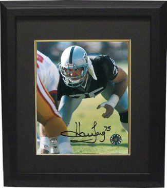 Howie Long collected 91½ sacks during his career. His career high was in 1983 with 13 sacks, including a career-high 5 against the Washington Redskins on October 2, 1983. He also intercepted 2 passes and recovered 10 fumbles during his 13-year career. At the time of his retirement, he was the last player still with the team who had been a Raider before the franchise moved to Los Angeles. He won a Super Bowl title with the Raiders in 1984 (following the 1983 season). Long's signature defensive move was the "rip," which employed a quick, uppercut-like motion designed to break an opposing blocker's grip. Howie Long has hand autographed this Oakland Raiders 8x10 Color Photo. NSD Hologram and Certificate of Authenticity from Athlon Sports. Custom Black Mat and Premium Black Frame as shown.
