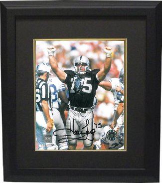 Howie Long collected 91½ sacks during his career. His career high was in 1983 with 13 sacks, including a career-high 5 against the Washington Redskins on October 2, 1983. He also intercepted 2 passes and recovered 10 fumbles during his 13-year career. At the time of his retirement, he was the last player still with the team who had been a Raider before the franchise moved to Los Angeles. He won a Super Bowl title with the Raiders in 1984 (following the 1983 season). Long's signature defensive move was the "rip," which employed a quick, uppercut-like motion designed to break an opposing blocker's grip. Howie Long has hand autographed this Oakland Raiders 8x10 Color Photo. NSD Hologram and Certificate of Authenticity from Athlon Sports. Custom Black Mat and Premium Black Frame as shown.