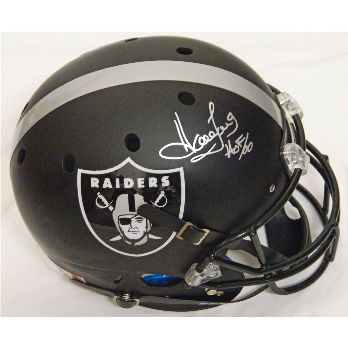 Howie Long signed Raiders custom black matte full size deluxe replica helmet with 'HOF 00' inscription. Item comes with a Schwartz Sports Memorabilia tamper-proof numbered hologram and Certificate of Authenticity which can be verified online.