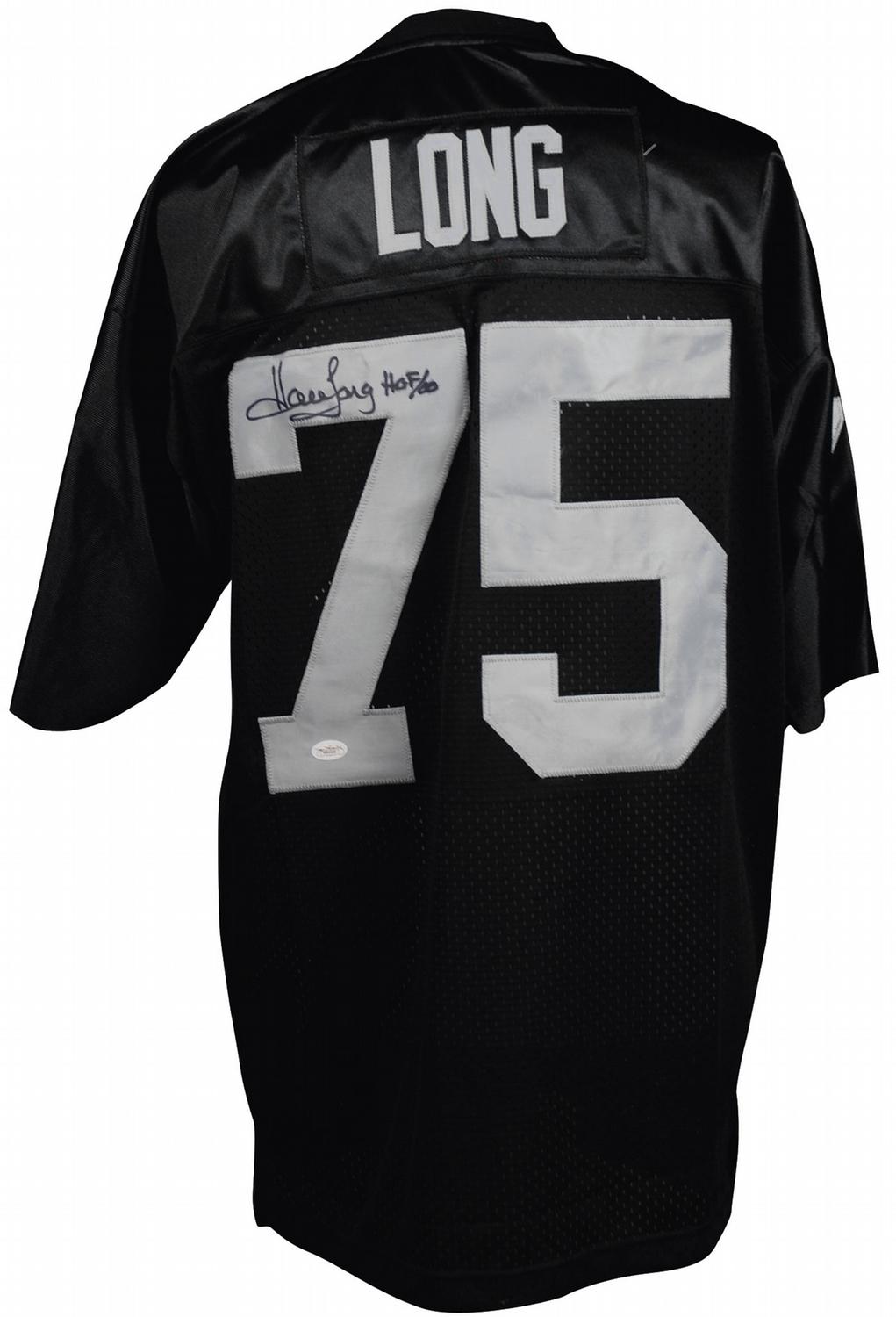 Replica Oakland Raiders football jersey, with sewn on letters and numbers, signed in black felt tip on the number on the back, “Howie Long, HOF/00.” In very fine condition with a James Spence authentication label affixed and accompanied by a certificate of authenticity from James Spence.